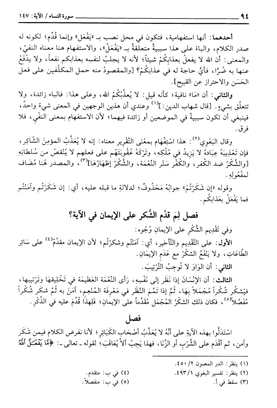 وقال البَغَوِي: هذا اسْتِفْهَام بمعْنَى التَّقْرير معناه: إنه لا يُعَذِّبُ المؤمِنَ الشَّاكِر، فإن تَعْذِيبَهُ عِبَادهُ لا يَزِيدُ في مُلْكِهِ، وتَرْكَهُ عُقُوبَتَهُم على فعلهم لا يُنْقصُ من سُلطانِه [والشُّكْرُ ضد الكُفر، والكُفْر سَتْر النِّعْمَة والشُّكْرُ إظهَارُهَا] ، والمصدر هُنا مُضَاف لمفْعُولِهِ.