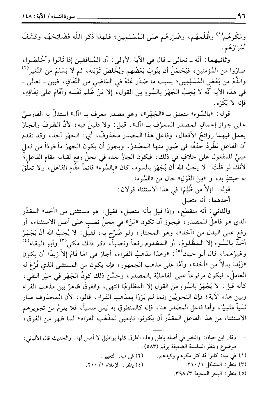 والثاني: أنه منقطع، وإذا قيل بأنه متصل، فقيل: هو مستثنى من «أحَد» المقدَّرِ الذي هو فاعلٌ للمصدر، فيجوز أن تكون «مَنْ» في محلِّ نصبٍ على أصل الاستثناء، أو رفعٍ على البدل من «أحَد» ، وهو المختار، ولو صُرِّح به، لقيل: لا يُحِبُّ الله أنْ يَجْهَرُ أحَدٌ بالسُّوء إلا المَظْلومُ، أو المظلومَ رفعاً ونصباً، ذكر ذلك مكي وأبو البقاء وغيرُهما، قال أبو حيان: «وهذا مذهبُ الفراء، أجاز في» مَا قَامَ إلاَّ زيدٌ «أن يكون» زَيْد «بدلاً من» أحَد «، وأمَّا على مذهب الجمهور، فإنه يكون من المستثنى الذي فُرِّغ له العاملُ، فيكون مرفوعاً على الفاعليَّة بالمصدر، وحسَّن ذلك كونُ الجَهْر في حيِّز النفي، كأنه قيل: لا يَجْهَرُ بالسُّوءِ من القولِ إلا المظلومُ» انتهى، والفرقُ ظاهرٌ بين مذهب الفراء وبين هذه الآية؛ فإن النحويِّين إنما لم يَرَوْا بمذهب الفراءِ، قالوا: لأن المحذوف صار نَسْياً مَنْسِيًّا، وأما فاعل المصْدر هنا، فإنه كالمنطوقِ به ليس منسياً، فلا يلزمُ من تجويزهم الاستثناء من هذا الفاعل المقدَّر أن يكونوا تابعين لمذْهَب الفرَّاء؛ لما ظهر من الفرق،