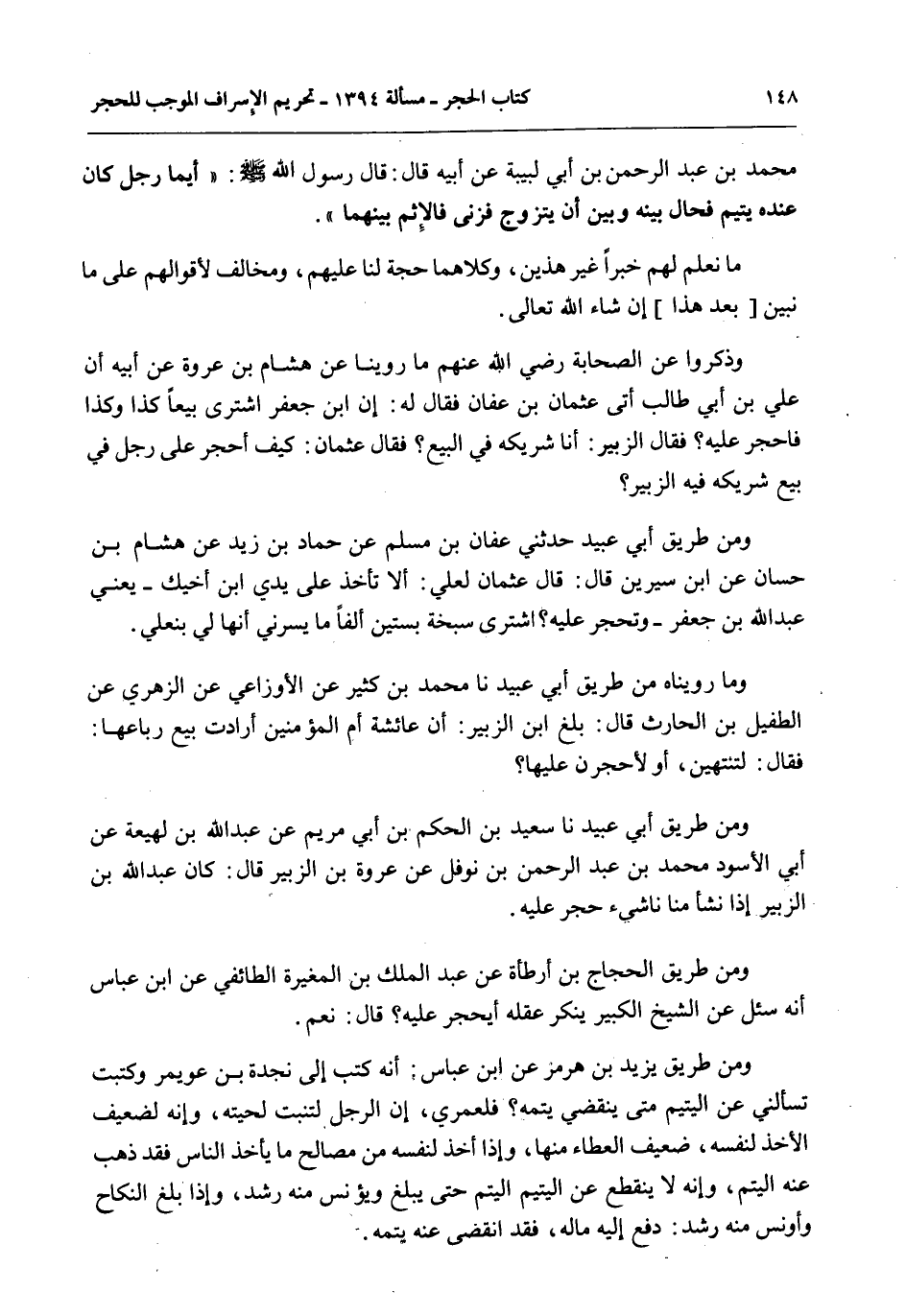 وَمَا رُوِّينَاهُ مِنْ طَرِيقِ أَبِي عُبَيْدٍ نا مُحَمَّدُ بْنُ كَثِيرٍ عَنْ الْأَوْزَاعِيِّ عَنْ الزُّهْرِيِّ عَنْ الطُّفَيْلِ بْنِ الْحَارِثِ قَالَ: بَلَغَ ابْنَ الزُّبَيْرِ: أَنَّ عَائِشَةَ أُمَّ الْمُؤْمِنِينَ أَرَادَتْ بَيْعَ رُبَاعِهَا: فَقَالَ: لَتَنْتَهِيَنَّ، أَوْ لَأَحْجُرَنَّ عَلَيْهَا؟ وَمِنْ طَرِيقِ أَبِي عُبَيْدٍ نا سَعِيدُ بْنُ الْحَكَمِ بْنِ أَبِي مَرْيَمَ عَنْ عَبْدِ اللَّهِ بْنِ لَهِيعَةَ عَنْ أَبِي الْأَسْوَدِ مُحَمَّدِ بْنِ عَبْدِ الرَّحْمَنِ بْنِ نَوْفَلٍ عَنْ عُرْوَةَ بْنِ الزُّبَيْرِ قَالَ: كَانَ عَبْدُ اللَّهِ بْنُ الزُّبَيْرِ إذَا نَشَأَ مِنَّا نَاشِئٌ حَجَرَ عَلَيْهِ.