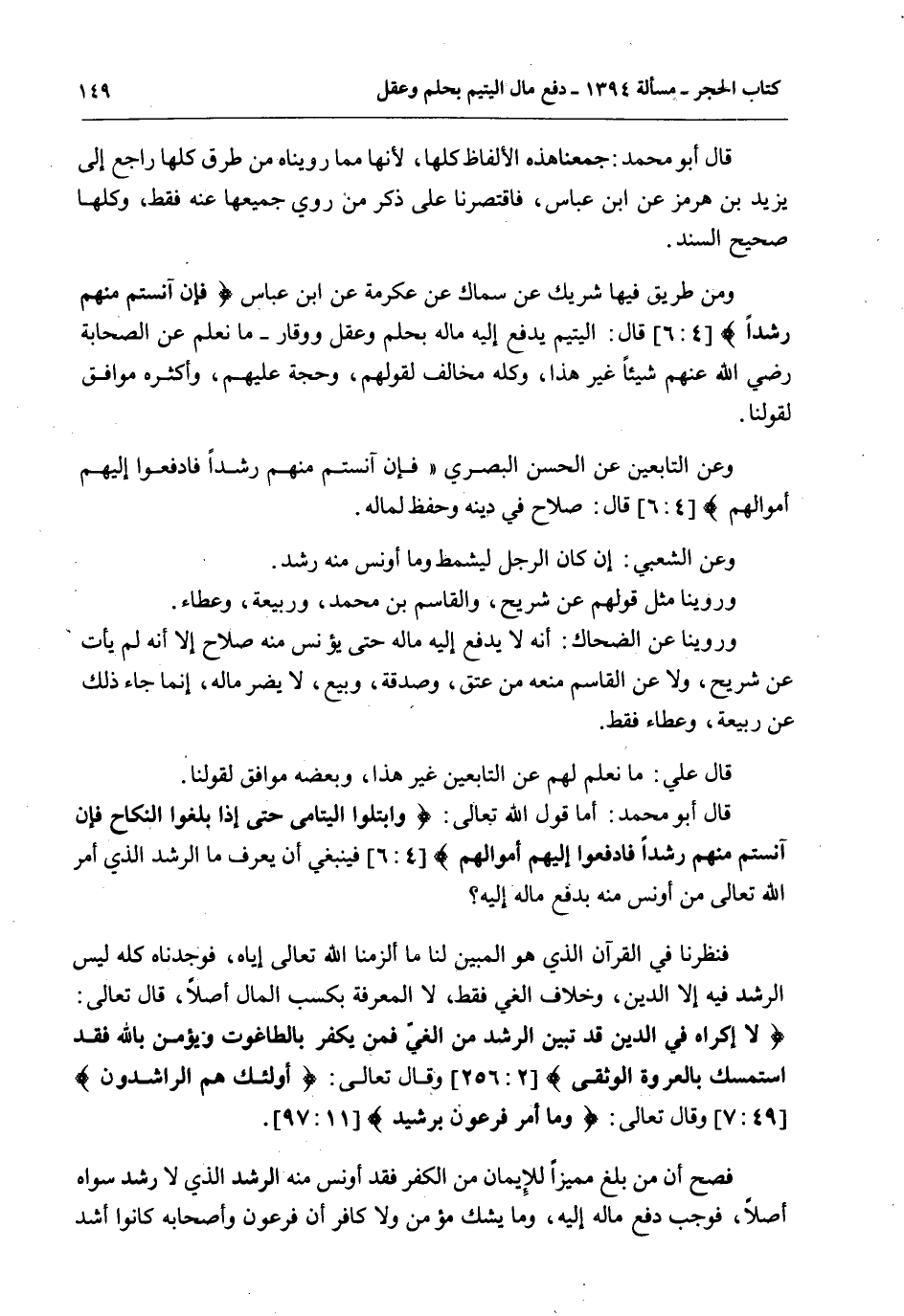 قَالَ أَبُو مُحَمَّدٍ: أَمَّا قَوْلُ اللَّهِ تَعَالَى: {وَابْتَلُوا الْيَتَامَى حَتَّى إِذَا بَلَغُوا النِّكَاحَ فَإِنْ آنَسْتُمْ مِنْهُمْ رُشْدًا فَادْفَعُوا إِلَيْهِمْ أَمْوَالَهُمْ} [النساء: 6] فَيَنْبَغِي أَنْ يُعْرَفَ مَا الرُّشْدُ الَّذِي أَمَرَ اللَّهُ تَعَالَى مَنْ أُونِسَ مِنْهُ بِدَفْعِ مَالِهِ إلَيْهِ؟ فَنَظَرْنَا فِي الْقُرْآنِ الَّذِي هُوَ الْمُبَيِّنُ لَنَا مَا أَلْزَمَنَا اللَّهُ تَعَالَى إيَّاهُ، فَوَجَدْنَاهُ كُلَّهُ لَيْسَ الرُّشْدُ فِيهِ إلَّا الدِّينَ، وَخِلَافَ الْغَيِّ فَقَطْ، لَا الْمَعْرِفَةَ بِكَسْبِ الْمَالِ أَصْلًا، قَالَ تَعَالَى: {لا إِكْرَاهَ فِي الدِّينِ قَدْ تَبَيَّنَ الرُّشْدُ مِنَ الْغَيِّ فَمَنْ يَكْفُرْ بِالطَّاغُوتِ وَيُؤْمِنْ بِاللَّهِ فَقَدِ اسْتَمْسَكَ بِالْعُرْوَةِ الْوُثْقَى} [البقرة: 256] وَقَالَ تَعَالَى: {أُولَئِكَ هُمُ الرَّاشِدُونَ} [الحجرات: 7] وَقَالَ تَعَالَى: {وَمَا أَمْرُ فِرْعَوْنَ بِرَشِيدٍ} [هود: 97] .