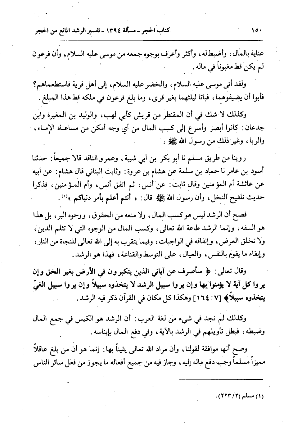رُوِّينَا مِنْ طَرِيقِ مُسْلِمٍ نا أَبُو بَكْرِ بْنُ أَبِي شَيْبَةَ، وَعَمْرٌو النَّاقِدُ قَالَا جَمِيعًا: حَدَّثَنَا أَسْوَدُ بْنُ عَامِرٍ نا حَمَّادُ بْنُ سَلَمَةَ عَنْ هِشَامِ بْنِ عُرْوَةَ: وَثَابِتٍ الْبُنَانِيِّ قَالَ هِشَامٌ: عَنْ أَبِيهِ عَنْ عَائِشَةَ أُمِّ الْمُؤْمِنِينَ وَقَالَ ثَابِتٌ: عَنْ أَنَسٍ، ثُمَّ اتَّفَقَ أَنَسٌ، وَأُمُّ الْمُؤْمِنِينَ فَذَكَرَا حَدِيثَ تَلْقِيحِ النَّخْلِ، وَأَنَّ رَسُولَ اللَّهِ - صَلَّى اللَّهُ عَلَيْهِ وَسَلَّمَ - قَالَ: «أَنْتُمْ أَعْلَمُ بِأَمْرِ دُنْيَاكُمْ» . فَصَحَّ أَنَّ الرُّشْدَ لَيْسَ هُوَ كَسْبَ الْمَالِ، وَلَا مَنْعَهُ مِنْ الْحُقُوقِ، وَوُجُوهِ الْبِرِّ، بَلْ هَذَا هُوَ السَّفَهُ، وَإِنَّمَا الرُّشْدُ طَاعَةُ اللَّهِ تَعَالَى، وَكَسْبُ الْمَالِ مِنْ الْوُجُوهِ الَّتِي لَا تَثْلِمُ الدِّينَ، وَلَا تَخْلَقُ الْعِرْضَ، وَإِنْفَاقُهُ فِي الْوَاجِبَاتِ، وَفِيمَا يُتَقَرَّبُ بِهِ إلَى اللَّهِ تَعَالَى لِلنَّجَاةِ مِنْ النَّارِ، وَإِبْقَاءُ مَا يَقُومُ بِالنَّفْسِ، وَالْعِيَالِ، عَلَى التَّوَسُّطِ وَالْقَنَاعَةِ، فَهَذَا هُوَ الرُّشْدُ.