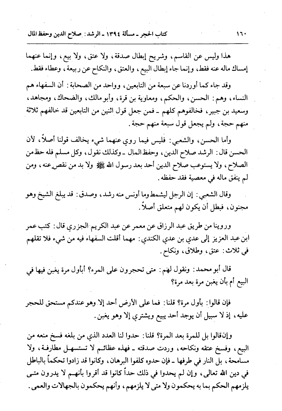 وَرُوِّينَا مِنْ طَرِيقِ عَبْدِ الرَّزَّاقِ عَنْ مَعْمَرٍ عَنْ عَبْدِ الْكَرِيمِ الْجَزَرِيِّ قَالَ: كَتَبَ عُمَرُ بْنُ عَبْدِ الْعَزِيزِ إلَى عَدِيِّ بْنِ عَدِيٍّ الْكِنْدِيِّ: مَهْمَا أَقَلْتَ السُّفَهَاءَ فِيهِ مِنْ شَيْءٍ فَلَا تُقِلْهُمْ فِي ثَلَاثٍ: عِتْقٍ، وَطَلَاقٍ، وَنِكَاحٍ.