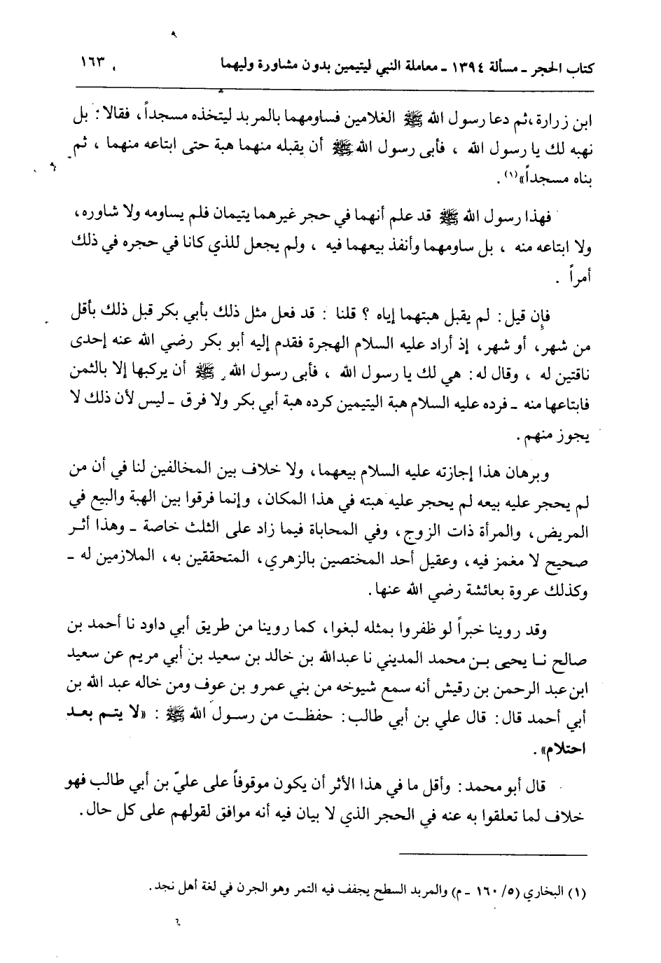 وَبُرْهَانُ هَذَا إجَازَتُهُ - عَلَيْهِ السَّلَامُ - بَيْعَهُمَا، وَلَا خِلَافَ بَيْنَ الْمُخَالِفِينَ لَنَا فِي أَنَّ مَنْ لَمْ يُحْجَرْ عَلَيْهِ بَيْعُهُ لَمْ يُحْجَرْ عَلَيْهِ هِبَتُهُ فِي هَذَا الْمَكَانِ، وَإِنَّمَا فَرَّقُوا بَيْنَ الْهِبَةِ وَالْبَيْعِ فِي الْمَرِيضِ، وَالْمَرْأَةِ ذَاتِ الزَّوْجِ، فِي الْمُحَابَاةِ فِيمَا زَادَ عَلَى الثُّلُثِ خَاصَّةً - وَهَذَا أَثَرٌ صَحِيحٌ لَا مَغْمَزَ فِيهِ، وَعُقَيْلٌ أَحَدُ الْمُخْتَصِّينَ بِالزُّهْرِيِّ، الْمُتَحَقِّقِينَ بِهِ، الْمُلَازِمِينَ لَهُ - وَكَذَلِكَ عُرْوَةُ بِعَائِشَةَ - رَضِيَ اللَّهُ عَنْهَا -.