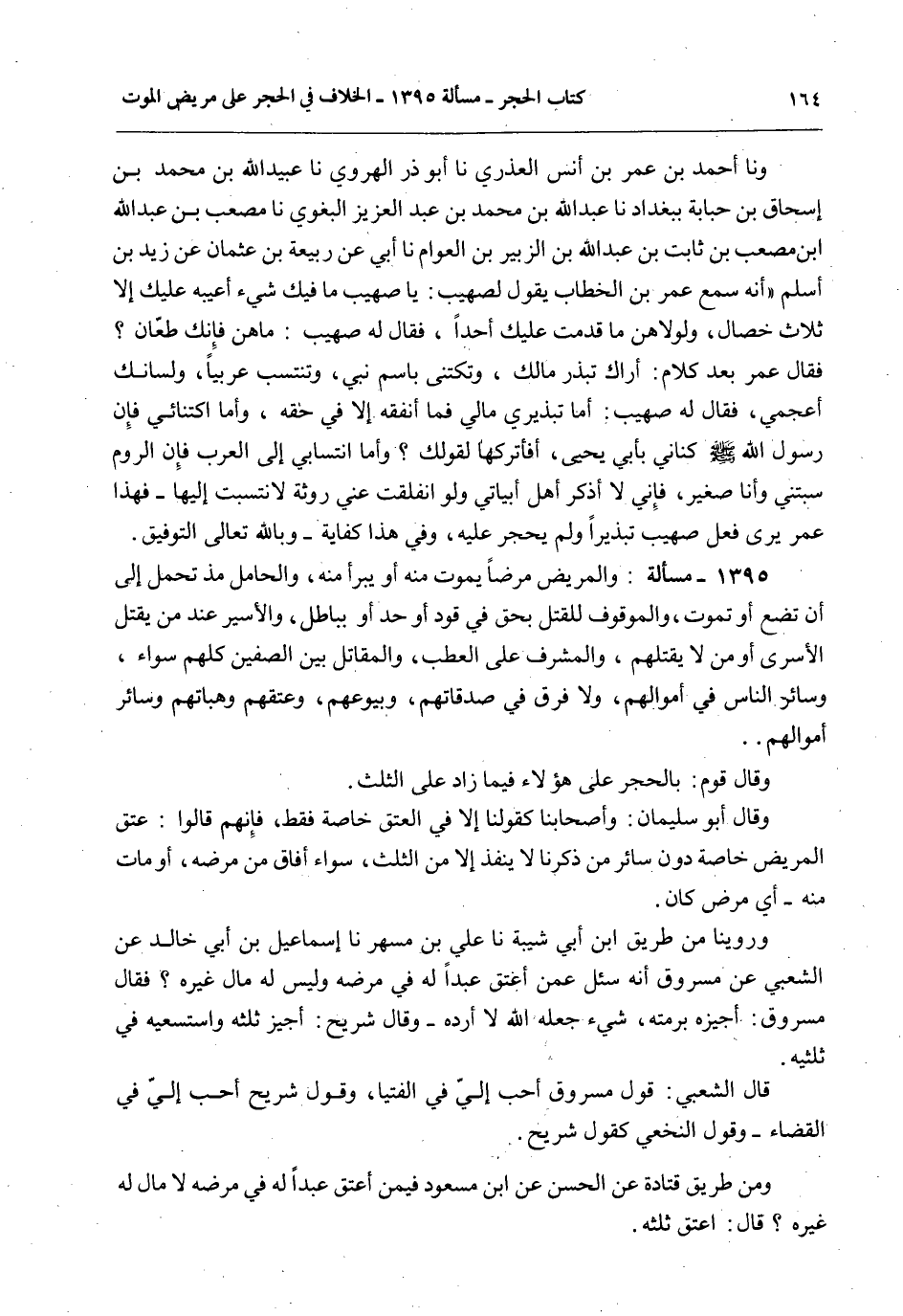 وَنَا أَحْمَدُ بْنُ عُمَرَ بْنِ أَنَسٍ الْعُذْرِيُّ نا أَبُو ذَرٍّ الْهَرَوِيُّ نا عُبَيْدُ اللَّهِ بْنُ مُحَمَّدِ بْنِ إِسْحَاقَ بْنِ حُبَابَةَ بِبَغْدَادَ نا عَبْدُ اللَّهِ بْنُ مُحَمَّدِ بْنِ عَبْدِ الْعَزِيزِ الْبَغَوِيّ نا مُصْعَبُ بْنُ عَبْدِ اللَّهِ بْنِ مُصْعَبِ بْنِ ثَابِتِ بْنِ عَبْدِ اللَّهِ بْنِ الزُّبَيْرِ بْنِ الْعَوَّامِ نَا أَبِي عَنْ رَبِيعَةَ بْنِ عُثْمَانَ عَنْ زَيْدِ بْنِ أَسْلَمَ " أَنَّهُ سَمِعَ عُمَرَ بْنَ الْخَطَّابِ يَقُولُ لِصُهَيْبٍ: يَا صُهَيْبُ مَا فِيك شَيْءٌ أَعِيبُهُ عَلَيْك إلَّا ثَلَاثَ خِصَالٍ، وَلَوْلَاهُنَّ مَا قَدَّمْت عَلَيْك أَحَدًا، فَقَالَ لَهُ صُهَيْبٌ: مَا هُنَّ فَإِنَّك طَعَّانٌ؟ فَقَالَ عُمَرُ بَعْدَ كَلَامٍ: أَرَاك تُبَذِّرُ مَالَك، وَتُكْتَنَى بِاسْمِ نَبِيٍّ، وَتُنْتَسَبُ عَرَبِيًّا، وَلِسَانُك أَعْجَمِيٌّ، فَقَالَ لَهُ صُهَيْبٌ: أَمَّا تَبْذِيرِي مَالِي فَمَا أُنْفِقُهُ إلَّا فِي حَقِّهِ، وَأَمَّا اكْتِنَائِي فَإِنَّ رَسُولَ اللَّهِ - صَلَّى اللَّهُ عَلَيْهِ وَسَلَّمَ - كَنَّانِي بِأَبِي يَحْيَى، أَفَأَتْرُكُهَا لِقَوْلِك؟ وَأَمَّا انْتِسَابِي إلَى الْعَرَبِ فَإِنَّ الرُّومَ سَبَتْنِي وَأَنَا صَغِيرٌ، فَإِنِّي لَا أَذْكُرُ أَهْلَ أَبْيَاتِي وَلَوْ انْفَلَقَتْ عَنِّي رَوْثَةٌ لَانْتَسَبْت إلَيْهَا - فَهَذَا عُمَرُ يَرَى فِعْلَ صُهَيْبٍ تَبْذِيرًا وَلَمْ يَحْجُرْ عَلَيْهِ، وَفِي هَذَا كِفَايَةٌ - وَبِاَللَّهِ تَعَالَى التَّوْفِيقُ.