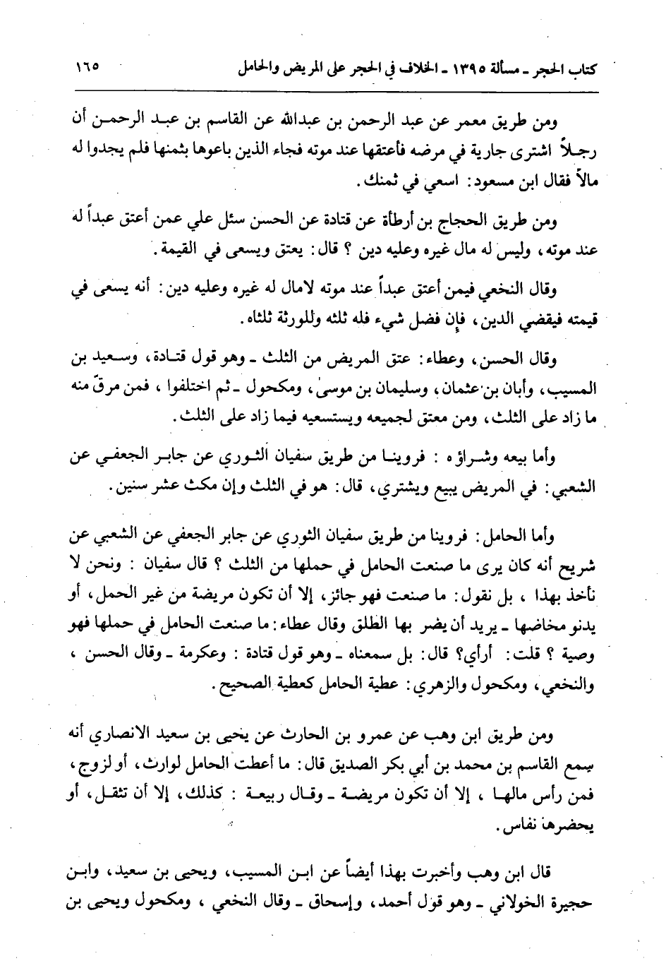 وَأَمَّا الْحَامِلُ: فَرُوِّينَا مِنْ طَرِيقِ سُفْيَانَ الثَّوْرِيِّ عَنْ جَابِرٍ الْجُعْفِيِّ عَنْ الشَّعْبِيِّ عَنْ شُرَيْحٍ أَنَّهُ كَانَ يَرَى مَا صَنَعَتْ الْحَامِلُ فِي حَمْلِهَا مِنْ الثُّلُثِ؟ قَالَ سُفْيَانُ: وَنَحْنُ لَا نَأْخُذُ بِهَذَا، بَلْ نَقُولُ: مَا صَنَعَتْ فَهُوَ جَائِزٌ، إلَّا أَنْ تَكُونَ مَرِيضَةً مِنْ غَيْرِ الْحَمْلِ، أَوْ يَدْنُوَ مَخَاضُهَا - يُرِيدُ أَنْ يَضُرَّ بِهَا الطَّلْقُ وَقَالَ عَطَاءٌ: مَا صَنَعَتْ الْحَامِلُ فِي حَمْلِهَا فَهُوَ وَصِيَّةٌ؟ قُلْتُ: أَرَأْيٌ؟ قَالَ: بَلْ سَمِعْنَاهُ - وَهُوَ قَوْلُ قَتَادَةَ: وَعِكْرِمَةَ - وَقَالَ الْحَسَنُ، وَالنَّخَعِيُّ، وَمَكْحُولٌ وَالزُّهْرِيِّ: عَطِيَّةُ الْحَامِلِ كَعَطِيَّةِ الصَّحِيحِ.