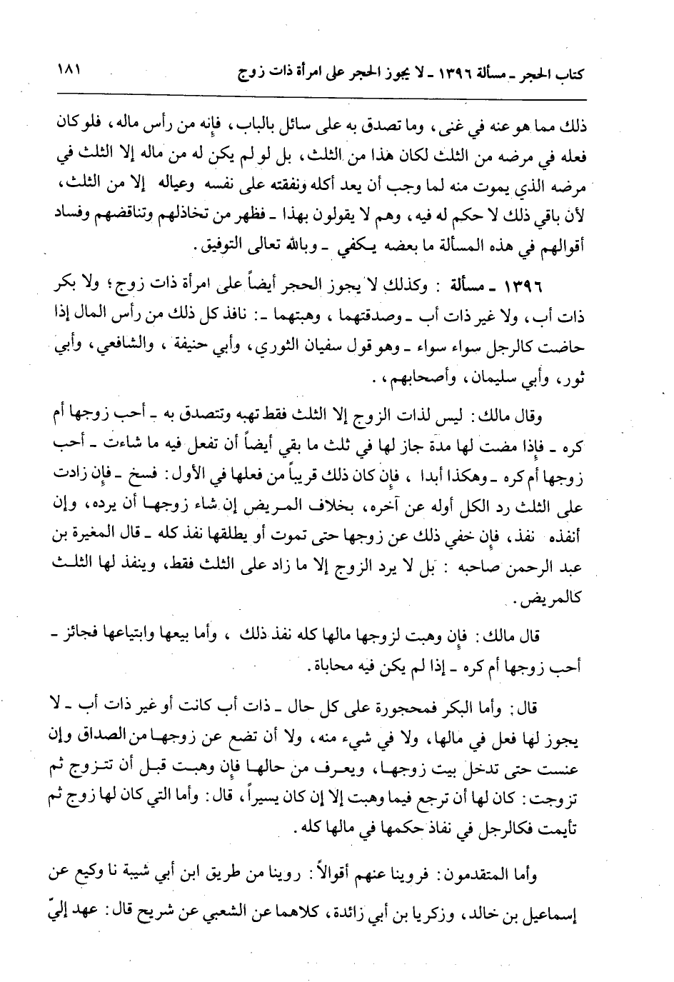 1396 - مَسْأَلَةٌ: وَكَذَلِكَ لَا يَجُوزُ الْحَجْرُ أَيْضًا عَلَى امْرَأَةٍ ذَاتِ زَوْجٍ؛ وَلَا بِكْرٍ ذَاتِ أَبٍ، وَلَا غَيْرِ ذَاتِ أَبٍ - وَصَدَقَتُهُمَا، وَهِبَتُهُمَا -: نَافِذٌ كُلُّ ذَلِكَ مِنْ رَأْسِ الْمَالِ إذَا حَاضَتْ كَالرَّجُلِ سَوَاءً سَوَاءً - وَهُوَ قَوْلُ سُفْيَانَ الثَّوْرِيِّ، وَأَبِي حَنِيفَةَ، وَالشَّافِعِيِّ، وَأَبِي ثَوْرٍ وَأَبِي سُلَيْمَانَ، وَأَصْحَابِهِمْ.