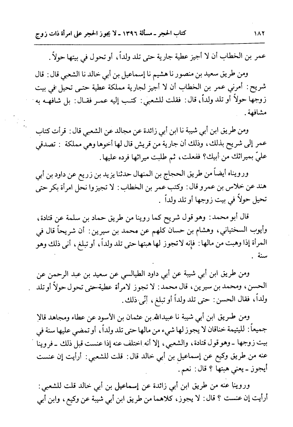 وَمِنْ طَرِيقِ سَعِيدِ بْنِ مَنْصُورٍ نا هُشَيْمٌ نا إسْمَاعِيلُ بْنُ أَبِي خَالِدٍ نا الشَّعْبِيُّ قَالَ: قَالَ شُرَيْحٌ: أَمَرَنِي عُمَرُ بْنُ الْخَطَّابِ أَنْ لَا أُجِيزَ لِجَارِيَةٍ مُمَلَّكَةٍ عَطِيَّةً حَتَّى تَحِيلَ فِي بَيْتِ زَوْجِهَا حَوْلًا أَوْ تَلِدَ وَلَدًا، قَالَ: فَقُلْت لِلشَّعْبِيِّ: كَتَبَ إلَيْهِ عُمَرُ فَقَالَ: بَلْ شَافَهَهُ بِهِ مُشَافَهَةً.