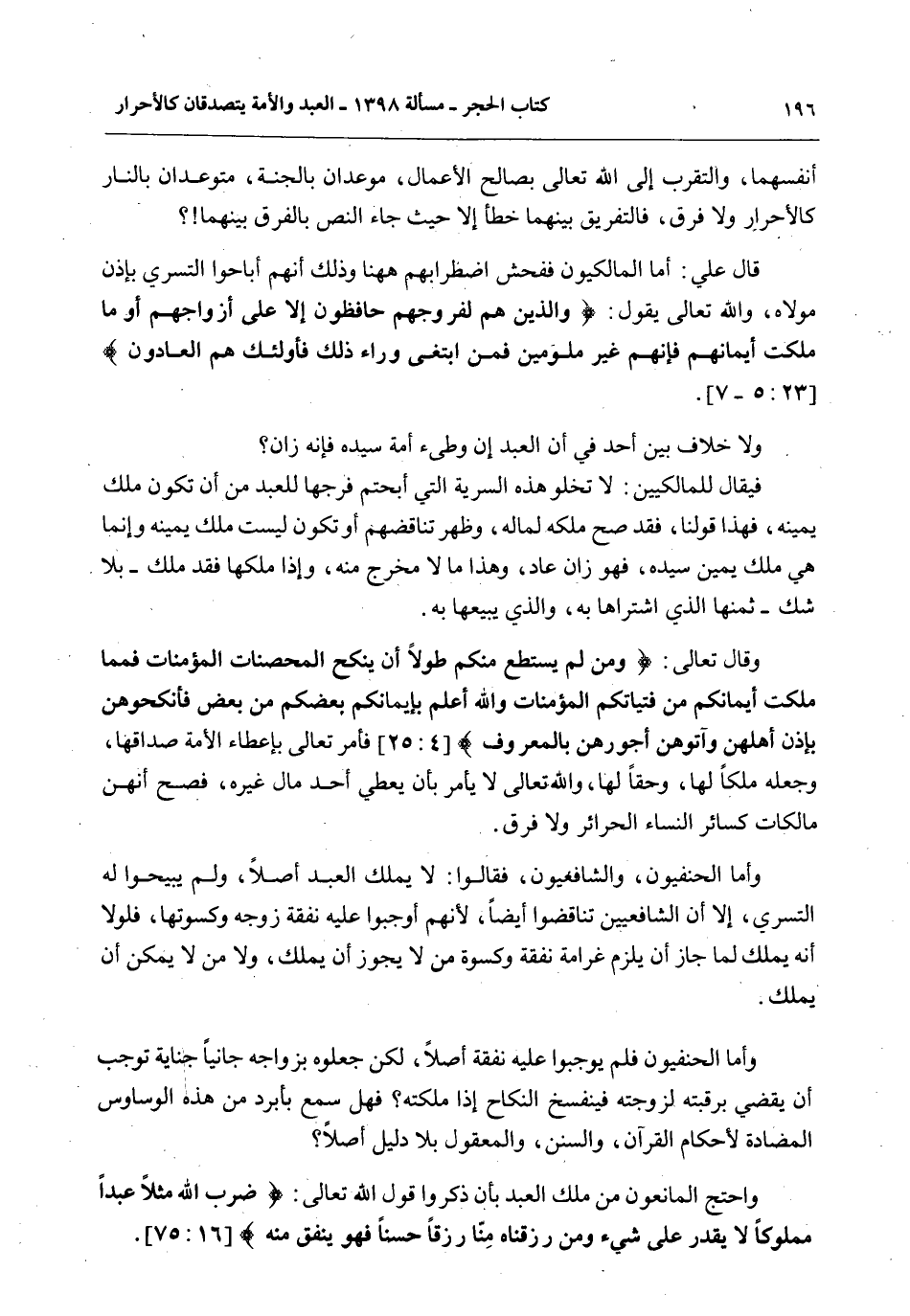 أَنْفُسِهِمَا، وَالتَّقَرُّبِ إلَى اللَّهِ تَعَالَى بِصَالِحِ الْأَعْمَالِ، مُوعَدَانِ بِالْجَنَّةِ، مُتَوَعَّدَانِ بِالنَّارِ كَالْأَحْرَارِ وَلَا فَرْقَ، فَالتَّفْرِيقُ بَيْنَهُمَا خَطَأٌ إلَّا حَيْثُ جَاءَ النَّصُّ بِالْفَرْقِ بَيْنَهُمَا؟ قَالَ عَلِيٌّ: أَمَّا الْمَالِكِيُّونَ فَفُحْشُ اضْطِرَابِهِمْ هَهُنَا وَذَلِكَ أَنَّهُمْ أَبَاحُوا التَّسَرِّي بِإِذْنِ مَوْلَاهُ، وَاَللَّهُ تَعَالَى يَقُولُ: {وَالَّذِينَ هُمْ لِفُرُوجِهِمْ حَافِظُونَ} [المؤمنون: 5] {إِلا عَلَى أَزْوَاجِهِمْ أوْ مَا مَلَكَتْ أَيْمَانُهُمْ فَإِنَّهُمْ غَيْرُ مَلُومِينَ} [المؤمنون: 6] {فَمَنِ ابْتَغَى وَرَاءَ ذَلِكَ فَأُولَئِكَ هُمُ الْعَادُونَ} [المؤمنون: 7]