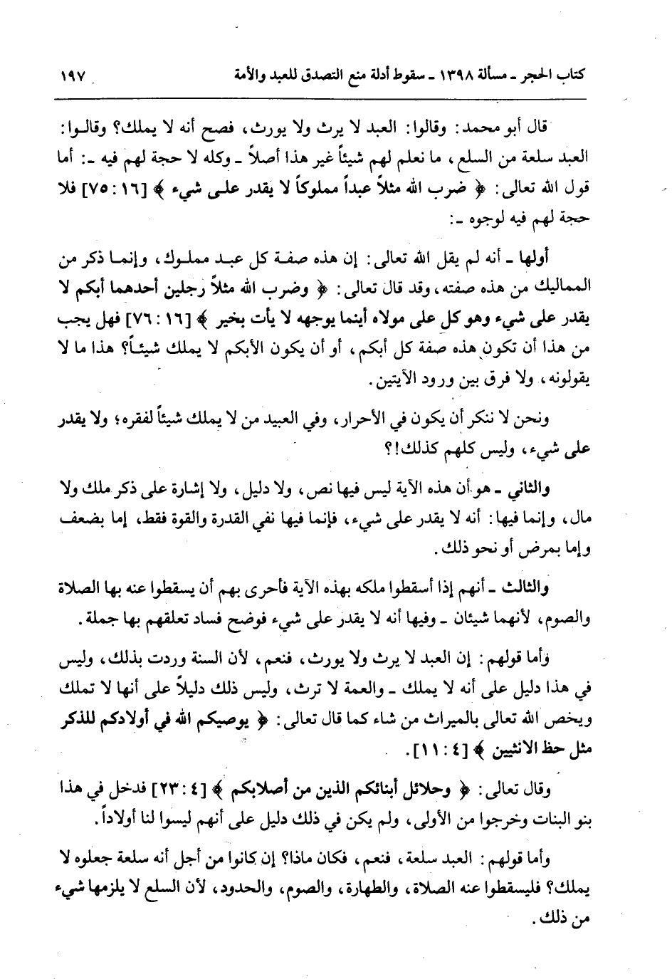 قَالَ أَبُو مُحَمَّدٍ: وَقَالُوا: الْعَبْدُ لَا يَرِثُ وَلَا يُوَرَّثُ، فَصَحَّ أَنَّهُ لَا يَمْلِكُ؟ وَقَالُوا: الْعَبْدُ سِلْعَةٌ مِنْ السِّلَعِ، مَا نَعْلَمُ لَهُمْ شَيْئًا غَيْرَ هَذَا أَصْلًا - كُلُّهُ لَا حُجَّةَ لَهُمْ فِيهِ -: أَمَّا قَوْلُ اللَّهِ تَعَالَى: {ضَرَبَ اللَّهُ مَثَلا عَبْدًا مَمْلُوكًا لا يَقْدِرُ عَلَى شَيْءٍ} [النحل: 75] فَلَا حُجَّةُ لَهُمْ فِيهِ لِوُجُوهٍ -: أَوَّلُهَا - أَنَّهُ لَمْ يَقُلْ اللَّهُ تَعَالَى: إنَّ هَذِهِ صِفَةُ كُلِّ عَبْدٍ مَمْلُوكٍ، وَإِنَّمَا ذَكَرَ مِنْ الْمَمَالِيكِ مَنْ هَذِهِ صِفَتُهُ، وَقَدْ قَالَ تَعَالَى: {وَضَرَبَ اللَّهُ مَثَلا رَجُلَيْنِ أَحَدُهُمَا أَبْكَمُ لا يَقْدِرُ عَلَى شَيْءٍ وَهُوَ كَلٌّ عَلَى مَوْلاهُ أَيْنَمَا يُوَجِّهْهُ لا يَأْتِ بِخَيْرٍ} [النحل: 76] فَهَلْ يَجِبُ مِنْ هَذَا أَنْ تَكُونَ، هَذِهِ صِفَةَ كُلِّ أَبْكَمَ، أَوْ أَنْ يَكُونَ الْأَبْكَمُ لَا يَمْلِكُ شَيْئًا؟ هَذَا مَا لَا يَقُولُونَهُ، وَلَا فَرْقَ بَيْنَ وُرُودِ الْآيَتَيْنِ.