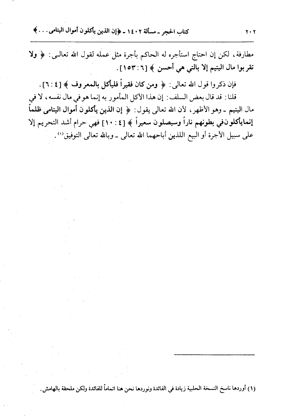 فَإِنْ ذَكَرُوا قَوْلَ اللَّهِ تَعَالَى: {وَمَنْ كَانَ فَقِيرًا فَلْيَأْكُلْ بِالْمَعْرُوفِ} [النساء: 6] قُلْنَا: قَدْ قَالَ بَعْضُ السَّلَفِ: إنَّ هَذَا الْأَكْلَ الْمَأْمُورَ بِهِ إنَّمَا هُوَ فِي مَالِ نَفْسِهِ، لَا فِي مَالِ الْيَتِيمِ - وَهُوَ الْأَظْهَرُ؛ لِأَنَّ اللَّهَ تَعَالَى يَقُولُ: {إِنَّ الَّذِينَ يَأْكُلُونَ أَمْوَالَ الْيَتَامَى ظُلْمًا إِنَّمَا يَأْكُلُونَ فِي بُطُونِهِمْ نَارًا وَسَيَصْلَوْنَ سَعِيرًا} [النساء: 10] فَهِيَ حَرَامٌ أَشَدُّ التَّحْرِيمِ إلَّا عَلَى سَبِيلِ الْأُجْرَةِ أَوْ الْبَيْعِ اللَّذَيْنِ أَبَاحَهُمَا اللَّهُ تَعَالَى - وَبِاَللَّهِ تَعَالَى التَّوْفِيقُ.