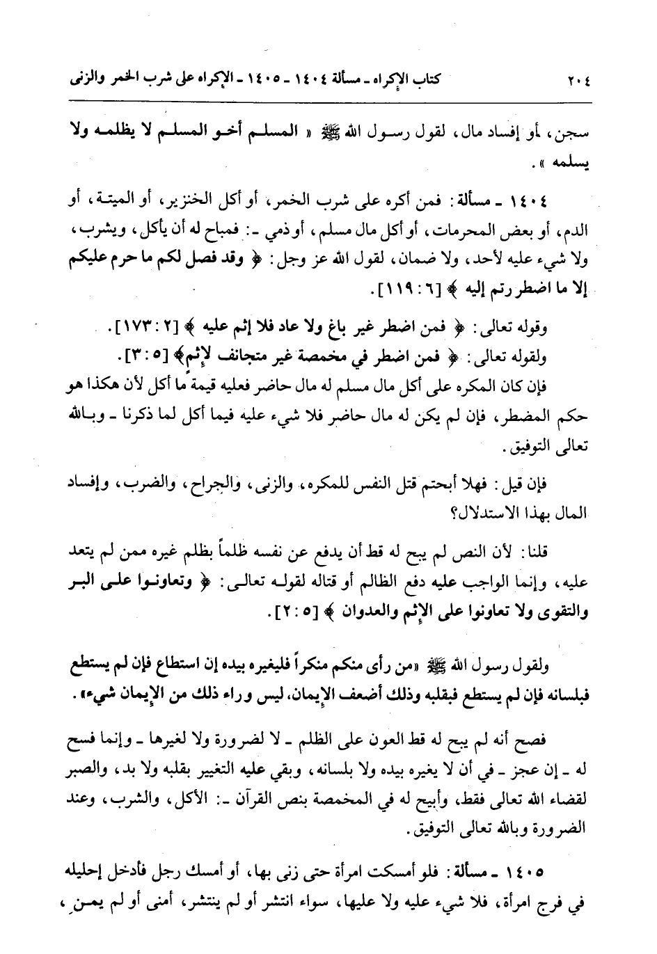 1404 - مَسْأَلَةٌ: فَمَنْ أُكْرِهَ عَلَى شُرْبِ الْخَمْرِ، أَوْ أَكْلِ الْخِنْزِيرِ، أَوْ الْمَيْتَةِ، أَوْ الدَّمِ، أَوْ بَعْضِ الْمُحَرَّمَاتِ، أَوْ أَكْلِ مَالِ مُسْلِمٍ، أَوْ ذِمِّيٍّ -: فَمُبَاحٌ لَهُ أَنْ يَأْكُلَ، وَيَشْرَبَ، وَلَا شَيْءَ عَلَيْهِ لِأَحَدٍ، وَلَا ضَمَانَ، لِقَوْلِ اللَّهِ عَزَّ وَجَلَّ: {وَقَدْ فَصَّلَ لَكُمْ مَا حَرَّمَ عَلَيْكُمْ إِلا مَا اضْطُرِرْتُمْ إِلَيْهِ} [الأنعام: 119] . وقَوْله تَعَالَى: {فَمَنِ اضْطُرَّ غَيْرَ بَاغٍ وَلا عَادٍ فَلا إِثْمَ عَلَيْهِ} [البقرة: 173] . وَلِقَوْلِهِ تَعَالَى: {فَمَنِ اضْطُرَّ فِي مَخْمَصَةٍ غَيْرَ مُتَجَانِفٍ لإِثْمٍ} [المائدة: 3] .