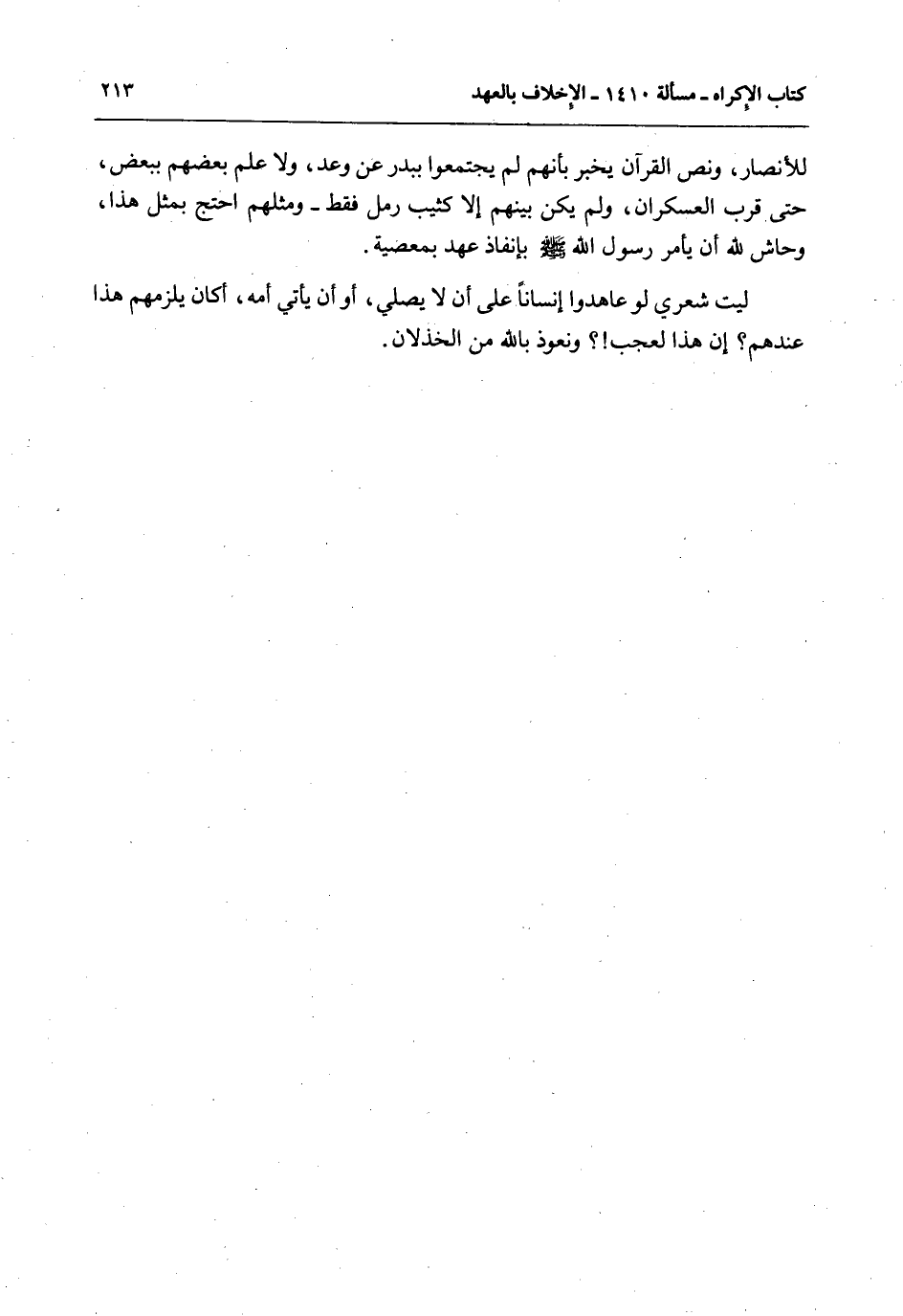 لَيْتَ شِعْرِي لَوْ عَاهَدُوا إنْسَانًا عَلَى أَنْ لَا يُصَلِّيَ، أَوْ أَنْ يَأْتِيَ أُمَّهُ، أَكَانَ يَلْزَمُهُمْ هَذَا عِنْدَهُمْ؟ إنَّ هَذَا لَعَجَبٌ؟ وَنَعُوذُ بِاَللَّهِ مِنْ الْخِذْلَانِ.