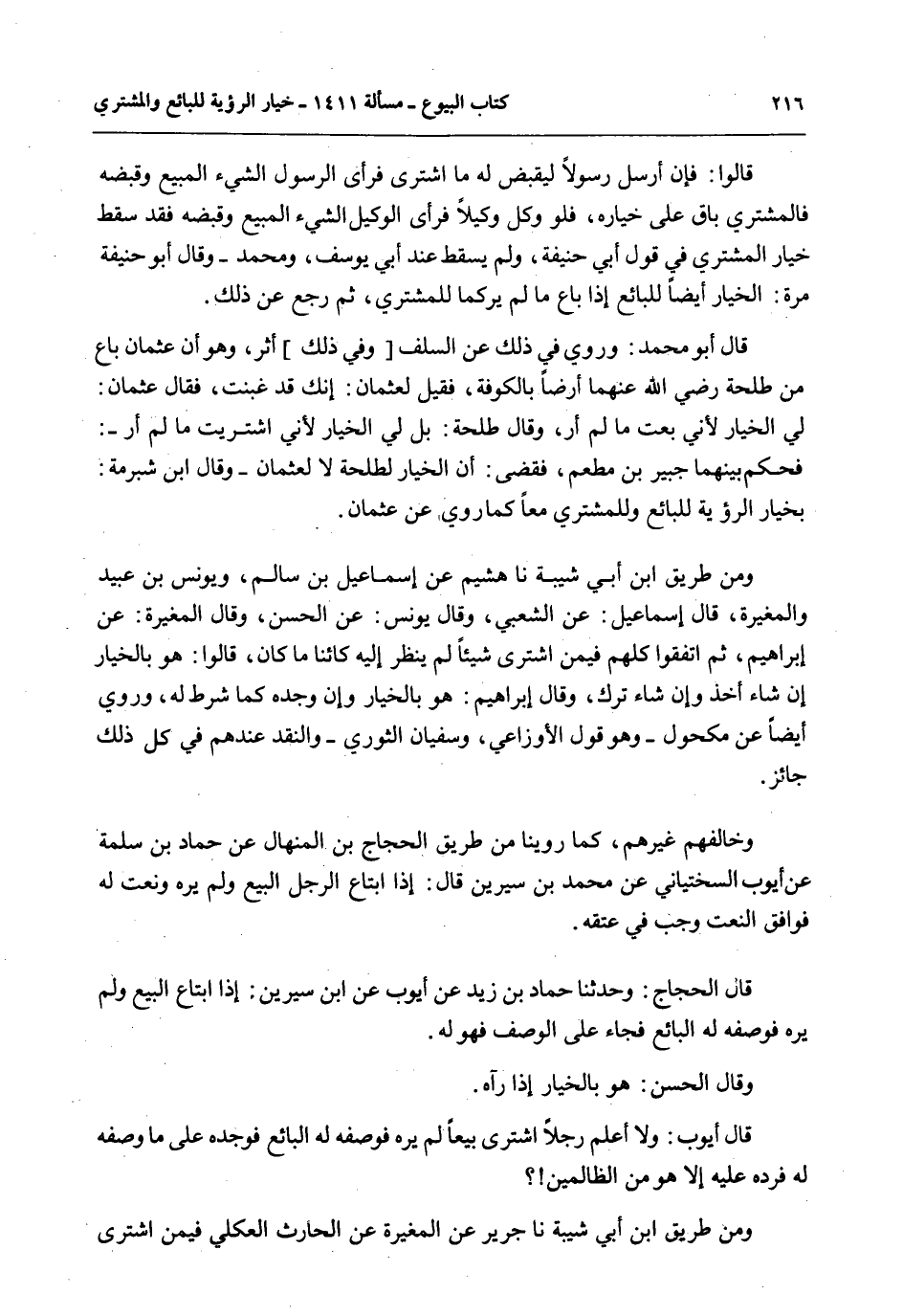 قَالَ أَبُو مُحَمَّدٍ: وَرُوِيَ فِي ذَلِكَ عَنْ السَّلَفِ وَفِي ذَلِكَ أَثَرٌ، وَهُوَ أَنَّ عُثْمَانَ بَاعَ مِنْ طَلْحَةَ - رَضِيَ اللَّهُ عَنْهُمَا - أَرْضًا بِالْكُوفَةِ، فَقِيلَ لِعُثْمَانَ: إنَّك قَدْ غَبَنْت، فَقَالَ عُثْمَانُ: لِي الْخِيَارُ لِأَنِّي بِعْتُ مَا لَمْ أَرَ، وَقَالَ طَلْحَةُ: بَلْ لِي الْخِيَارُ لِأَنِّي اشْتَرَيْت مَا لَمْ أَرَ -: فَحَكَمَ بَيْنَهُمَا جُبَيْرُ بْنُ مُطْعِمٍ، فَقَضَى: أَنَّ الْخِيَارَ لِطَلْحَةَ لَا لِعُثْمَانَ - وَقَالَ ابْنُ شُبْرُمَةَ: بِخِيَارِ الرُّؤْيَةِ لِلْبَائِعِ وَلِلْمُشْتَرِي مَعًا كَمَا رُوِيَ عَنْ عُثْمَانَ.