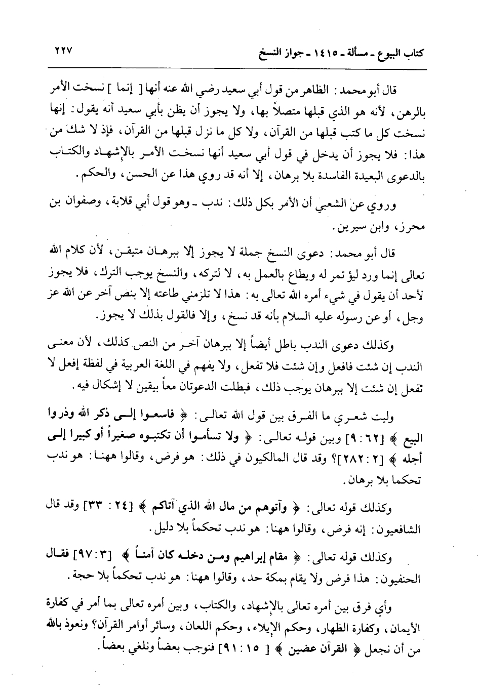 قَالَ أَبُو مُحَمَّدٍ: دَعْوَى النَّسْخِ جُمْلَةً لَا يَجُوزُ إلَّا بِبُرْهَانٍ مُتَيَقَّنٍ، لِأَنَّ كَلَامَ اللَّهِ تَعَالَى إنَّمَا وَرَدَ لِيُؤْتَمَرَ لَهُ وَيُطَاعَ بِالْعَمَلِ بِهِ، لَا لِتَرْكِهِ، وَالنَّسْخُ يُوجِبُ التَّرْكَ، فَلَا يَجُوزُ لِأَحَدٍ أَنْ يَقُولَ فِي شَيْءٍ أَمَرَهُ اللَّهُ تَعَالَى بِهِ: هَذَا لَا تَلْزَمُنِي طَاعَتُهُ إلَّا بِنَصٍّ آخَرَ عَنْ اللَّهِ عَزَّ وَجَلَّ، أَوْ عَنْ رَسُولِهِ - عَلَيْهِ السَّلَامُ - بِأَنَّهُ قَدْ نُسِخَ، وَإِلَّا فَالْقَوْلُ بِذَلِكَ لَا يَجُوزُ.