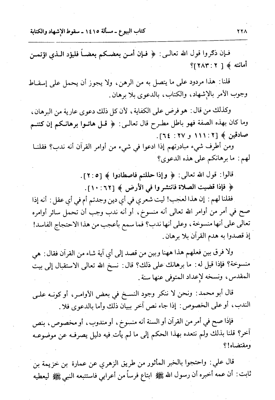 فَقُلْنَا لَهُمْ: إنَّ هَذَا لَعَجَبٌ لَيْتَ شِعْرِي فِي أَيِّ دِينٍ وَجَدْتُمْ أَمْ فِي أَيِّ عَقْلٍ: أَنَّهُ إذَا صَحَّ فِي أَمْرٍ مِنْ أَوَامِرِ اللَّهِ تَعَالَى أَنَّهُ مَنْسُوخٌ، أَوْ أَنَّهُ نَدْبٌ وَجَبَ أَنْ تُحْمَلَ سَائِرُ أَوَامِرِهِ تَعَالَى عَلَى أَنَّهَا مَنْسُوخَةٌ، وَعَلَى أَنَّهَا نَدْبٌ؟ فَمَا سُمِعَ بِأَعْجَبَ مِنْ هَذَا الِاحْتِجَاجِ الْفَاسِدِ إذْ قَصَدُوا بِهِ هَدْمَ الْقُرْآنِ بِلَا بُرْهَانٍ.