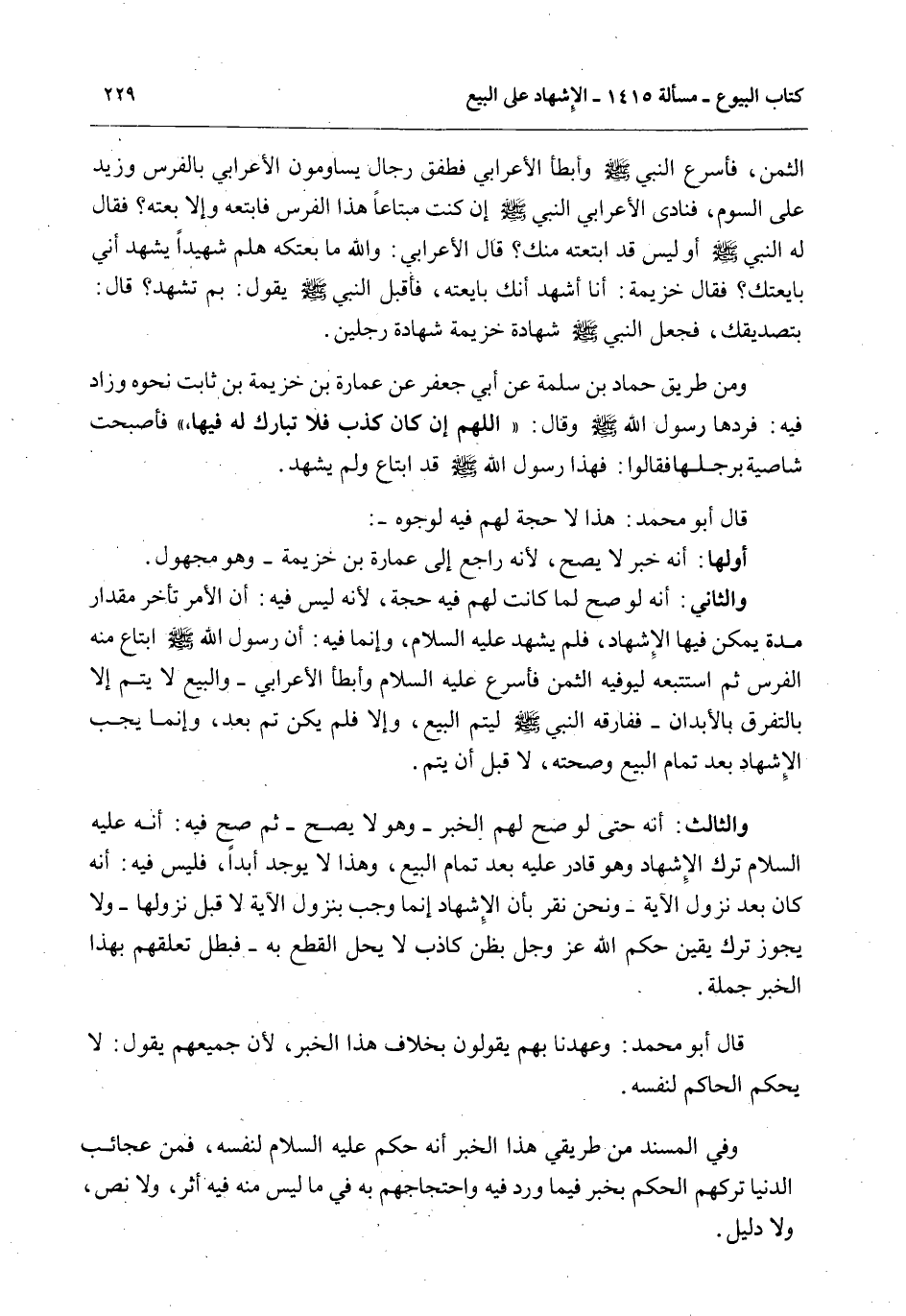 قَالَ أَبُو مُحَمَّدٍ: هَذَا لَا حُجَّةَ لَهُمْ فِيهِ لِوُجُوهٍ -: أَوَّلُهَا: أَنَّهُ خَبَرٌ لَا يَصِحُّ لِأَنَّهُ رَاجِعٌ إلَى عُمَارَةَ بْنِ خُزَيْمَةَ - وَهُوَ مَجْهُولٌ.