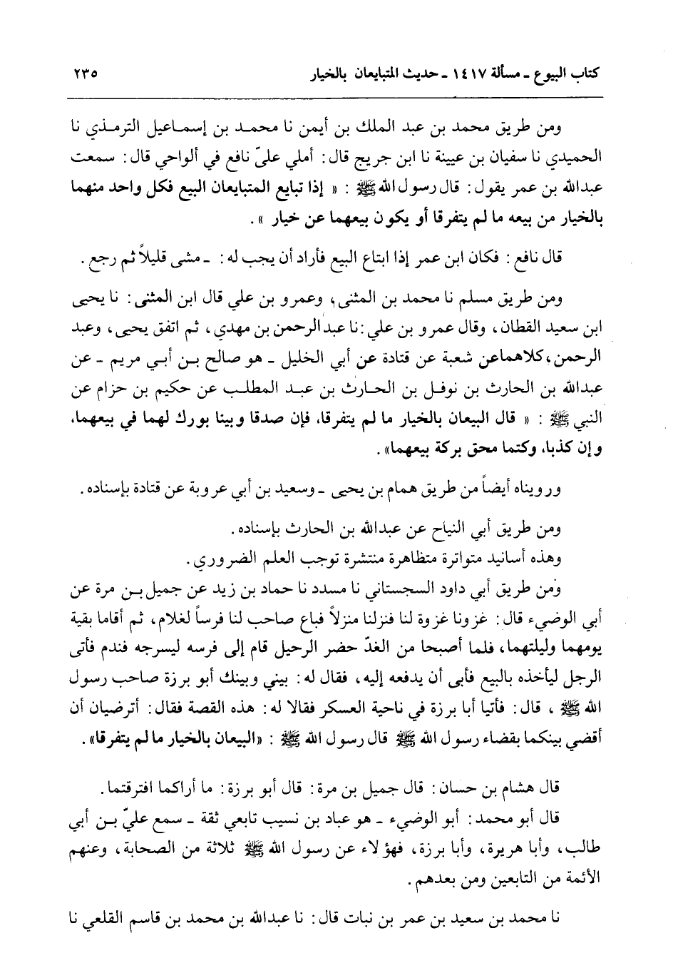 وَمِنْ طَرِيقِ مُسْلِمٍ نا مُحَمَّدُ بْنُ الْمُثَنَّى، وَعَمْرُو بْنُ عَلِيٍّ قَالَ ابْنُ الْمُثَنَّى: نا يَحْيَى بْنُ سَعِيدٍ الْقَطَّانُ، وَقَالَ عَمْرُو بْنُ عَلِيٍّ: نا عَبْدُ الرَّحْمَنِ بْنُ مَهْدِيٍّ، ثُمَّ اتَّفَقَ يَحْيَى، وَعَبْدُ الرَّحْمَنِ، كِلَاهُمَا عَنْ شُعْبَةَ عَنْ قَتَادَةَ عَنْ أَبِي الْخَلِيلِ - هُوَ صَالِحُ بْنُ أَبِي مَرْيَمَ - عَنْ عَبْدِ اللَّهِ بْنِ الْحَارِثِ بْنِ نَوْفَلِ بْنِ الْحَارِثِ بْنِ عَبْدِ الْمُطَّلِبِ عَنْ حَكِيمِ بْنِ حِزَامٍ عَنْ النَّبِيِّ - صَلَّى اللَّهُ عَلَيْهِ وَسَلَّمَ -: قَالَ «الْبَيِّعَانِ بِالْخِيَارِ مَا لَمْ يَتَفَرَّقَا، فَإِنْ صَدَقَا وَبَيَّنَا بُورِكَ لَهُمَا فِي بَيْعِهِمَا، وَإِنْ كَذَبَا، وَكَتَمَا مُحِقَ بَرَكَةُ بَيْعِهِمَا» .