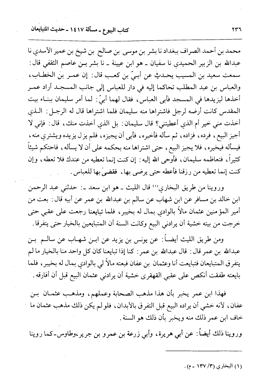 وَرُوِّينَا مِنْ طَرِيقِ الْبُخَارِيِّ قَالَ اللَّيْثُ هُوَ ابْنُ سَعْدٍ -: حَدَّثَنِي عَبْدُ الرَّحْمَنِ بْنُ خَالِدِ بْنِ مُسَافِرٍ عَنْ ابْنِ شِهَابٍ عَنْ سَالِمِ بْنِ عَبْدِ اللَّهِ بْنِ عُمَرَ عَنْ أَبِيهِ قَالَ: بِعْت مِنْ أَمِيرِ الْمُؤْمِنِينَ عُثْمَانَ مَالًا بِالْوَادِي بِمَالٍ لَهُ بِخَيْبَرَ، فَلَمَّا تَبَايَعْنَا رَجَعْت عَلَى عَقِبَيَّ حَتَّى خَرَجْت مِنْ بَيْتِهِ خَشْيَةَ أَنْ يُرَادَّنِي الْبَيْعَ وَكَانَتْ السُّنَّةُ أَنَّ الْمُتَبَايِعَيْنِ بِالْخِيَارِ حَتَّى يَتَفَرَّقَا.