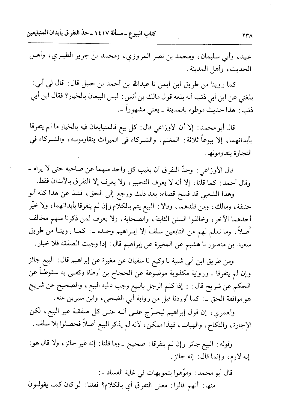 وَهَذَا الشَّعْبِيُّ قَدْ فَسَخَ قَضَاءَهُ بَعْدَ ذَلِكَ وَرَجَعَ إلَى الْحَقِّ، فَشَذَّ عَنْ هَذَا كُلِّهِ أَبُو حَنِيفَةَ، وَمَالِكٌ، وَمَنْ قَلَّدَهُمَا، وَقَالَا: الْبَيْعُ يَتِمُّ بِالْكَلَامِ وَإِنْ لَمْ يَتَفَرَّقَا بِأَبْدَانِهِمَا، وَلَا خَيَّرَ أَحَدُهُمَا الْآخَرَ، وَخَالَفُوا السُّنَنَ الثَّابِتَةَ، وَالصَّحَابَةَ، وَلَا يُعْرَفُ لِمَنْ ذَكَرْنَا مِنْهُمْ مُخَالِفٌ أَصْلًا، وَمَا نَعْلَمُ لَهُمْ مِنْ التَّابِعِينَ سَلَفًا إلَّا إبْرَاهِيمَ وَحْدَهُ -: كَمَا رُوِّينَا مِنْ طَرِيقِ سَعِيدِ بْنِ مَنْصُورٍ نا هُشَيْمٌ عَنْ الْمُغِيرَةِ عَنْ إبْرَاهِيمَ قَالَ: إذَا وَجَبَتْ الصَّفْقَةُ فَلَا خِيَارَ.