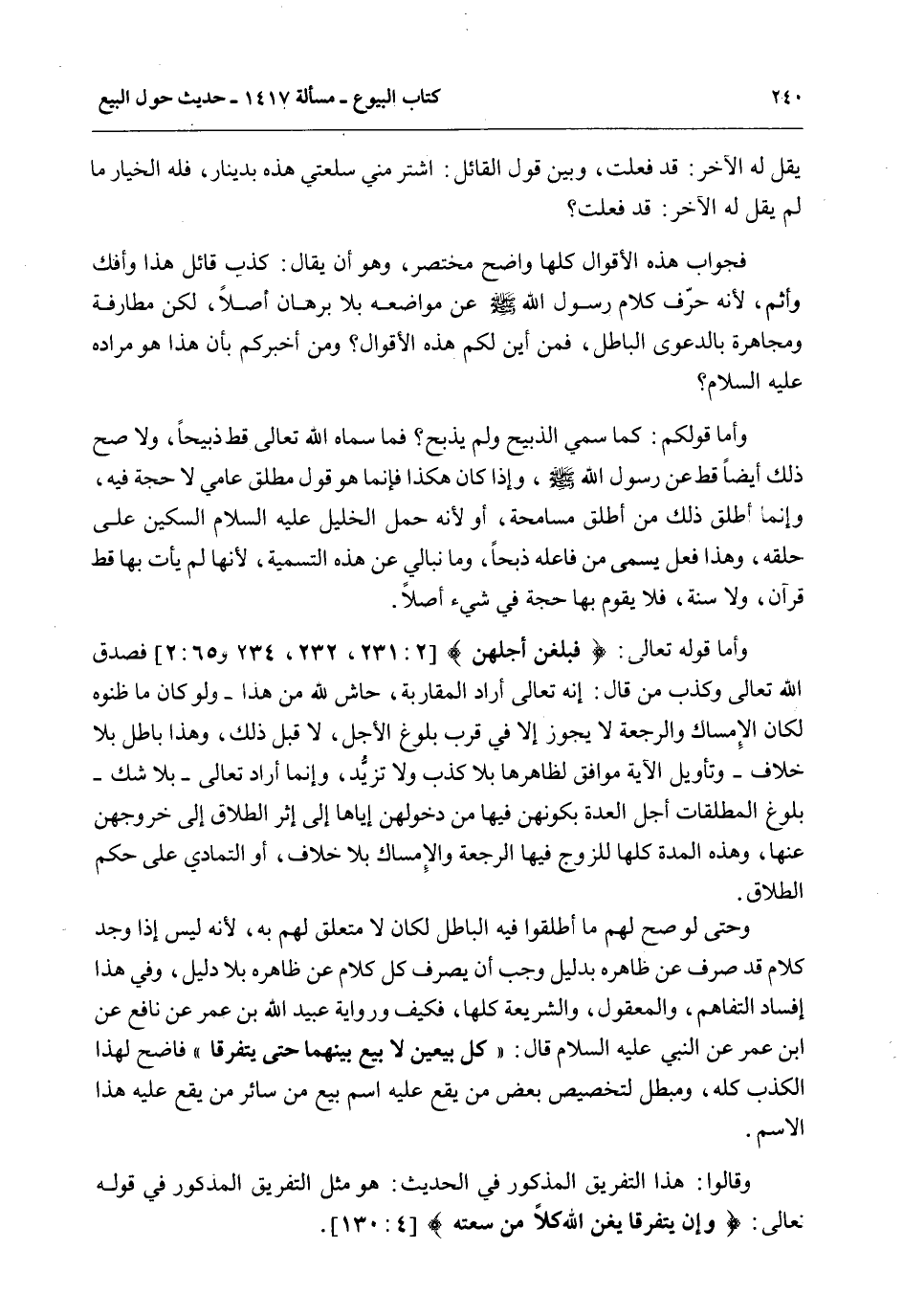 يَقُلْ لَهُ الْآخَرُ: قَدْ فَعَلْت، وَبَيْنَ قَوْلِ الْقَائِلِ: اشْتَرِ مِنِّي سِلْعَتِي هَذِهِ بِدِينَارٍ، فَلَهُ الْخِيَارُ مَا لَمْ يَقُلْ لَهُ الْآخَرُ: قَدْ فَعَلْت؟ فَجَوَابُ هَذِهِ الْأَقْوَالِ كُلِّهَا وَاضِحٌ مُخْتَصَرٌ، وَهُوَ أَنْ يُقَالَ: كَذَبَ قَائِلُ هَذَا وَأَفَكَ وَأَثِمَ؛ لِأَنَّهُ حَرَّفَ كَلَامَ رَسُولِ اللَّهِ - صَلَّى اللَّهُ عَلَيْهِ وَسَلَّمَ - عَنْ مَوَاضِعِهِ بِلَا بُرْهَانٍ أَصْلًا، لَكِنْ مُطَارَفَةً وَمُجَاهَرَةً بِالدَّعْوَى الْبَاطِلِ، فَمِنْ أَيْنَ لَكُمْ هَذِهِ الْأَقْوَالُ؟ وَمَنْ أَخْبَرَكُمْ بِأَنَّ هَذَا هُوَ مُرَادُهُ - عَلَيْهِ السَّلَامُ -؟ وَأَمَّا قَوْلُكُمْ: كَمَا سُمِّيَ الذَّبِيحُ وَلَمْ يُذْبَحْ؟ فَمَا سَمَّاهُ اللَّهُ تَعَالَى قَطُّ ذَبِيحًا، وَلَا صَحَّ ذَلِكَ أَيْضًا قَطُّ عَنْ رَسُولِ اللَّهِ - صَلَّى اللَّهُ عَلَيْهِ وَسَلَّمَ - وَإِذَا كَانَ هَكَذَا فَإِنَّمَا هُوَ قَوْلٌ مُطْلَقٌ عَامِّيٌّ لَا حُجَّةَ فِيهِ، وَإِنَّمَا أَطْلَقَ ذَلِكَ مَنْ أَطْلَقَ مُسَامَحَةً، أَوْ لِأَنَّهُ حَمَلَ الْخَلِيلُ - عَلَيْهِ السَّلَامُ - السِّكِّينَ عَلَى حَلْقِهِ، وَهَذَا فِعْلٌ يُسَمَّى مِنْ فَاعِلِهِ ذَبْحًا، وَمَا نُبَالِي عَنْ هَذِهِ التَّسْمِيَةِ؛ لِأَنَّهَا لَمْ يَأْتِ بِهَا قَطُّ قُرْآنٌ، وَلَا سُنَّةٌ، فَلَا يَقُومُ بِهَا حُجَّةٌ فِي شَيْءٍ أَصْلًا.