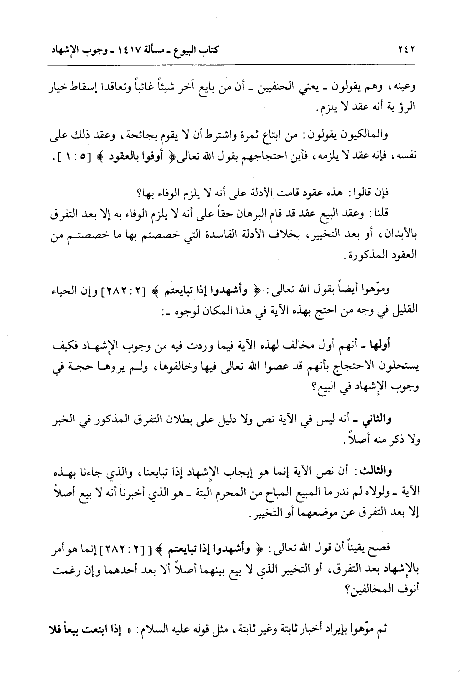 وَالثَّالِثِ: أَنَّ نَصَّ الْآيَةِ إنَّمَا هُوَ إيجَابُ الْإِشْهَادِ إذَا تَبَايَعْنَا، وَاَلَّذِي جَاءَنَا بِهَذِهِ الْآيَةِ - وَلَوْلَاهُ لَمْ نَدْرِ مَا الْمَبِيعُ الْمُبَاحُ مِنْ الْمُحَرَّمِ أَلْبَتَّةَ - هُوَ الَّذِي أَخْبَرَنَا أَنَّهُ لَا بَيْعَ أَصْلًا إلَّا بَعْدَ التَّفَرُّقِ عَنْ مَوْضِعِهِمَا أَوْ التَّخْيِيرِ. فَصَحَّ يَقِينًا أَنَّ قَوْلَ اللَّهِ تَعَالَى: {وَأَشْهِدُوا إِذَا تَبَايَعْتُمْ} [البقرة: 282] إنَّمَا هُوَ أَمْرٌ بِالْإِشْهَادِ بَعْدَ التَّفَرُّقِ، أَوْ التَّخْيِيرِ الَّذِي لَا بَيْعَ بَيْنَهُمَا أَصْلًا إلَّا بَعْدَ أَحَدِهِمَا وَإِنْ رَغِمَتْ أُنُوفُ الْمُخَالِفِينَ؟ ثُمَّ مَوَّهُوا بِإِيرَادِ أَخْبَارٍ ثَابِتَةٍ وَغَيْرِ ثَابِتَةٍ، مِثْلِ قَوْلِهِ - عَلَيْهِ السَّلَامُ -: «إذَا ابْتَعْت بَيْعًا فَلَا