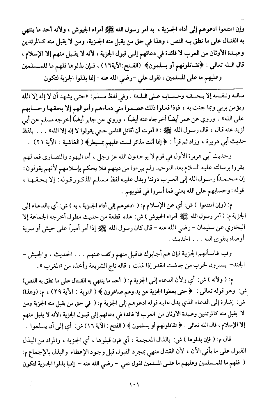 ـــــــــــــــــــــــــــــQماله ونفسه إلا بحقه وحسابه على الله» . وفي لفظ مسلم: «حتى يشهد أن لا إله إلا الله ويؤمن بربي وبما جئت به، فإذا فعلوا ذلك عصموا مني دماءهم وأموالهم إلا بحقها وحسابهم على الله» . وروي عن عمر أيضاً أخرجاه عنه أيضاً، وروي عن جابر أيضاً أخرجه مسلم عن أبي الزيد عنه قال: قال رسول الله - صَلَّى اللَّهُ عَلَيْهِ وَسَلَّمَ -: «أمرت أن أقاتل الناس حتى يقولوا لا إله إلا الله» ... بلفظ حديث أبي هريرة، وزاد ثم قرأ: {إِنَّمَا أَنْتَ مُذَكِّرٌ} [الغاشية: 21] {لَسْتَ عَلَيْهِمْ بِمُسَيْطِرٍ} [الغاشية: 22] (الغاشية: الآية 21 - 22) .