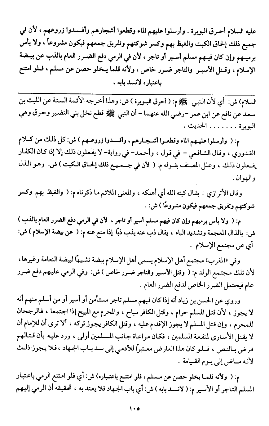 وروي عن الحسن بن زياد أنه إذا كان فيهم مسلم تاجر مستأمن أو أسير أو من أسلم منهم أنه لا يجوز، لأن قتل المسلم حرام، وقتل الكافر مباح، والمحرم مع المبيح إذا اجتمعا، فالرجحان للمحرم، وإن قتل المسلم لا يجوز الإقدام عليه، وقتل الكافر يجوز تركه، ألا ترى أن للإمام أن لا يقتل الأسارى لمنفعة المسلمين، فكان مراعاة جانب المسلمين أولى، ورد عليه بأن قتالهم فرض بالنص، فلو كان هذا العارض معتبراً للآدمي إلى سد باب الجهاد، فلا يجوز ذلك لأنه ماض إلى يوم القيامة.
