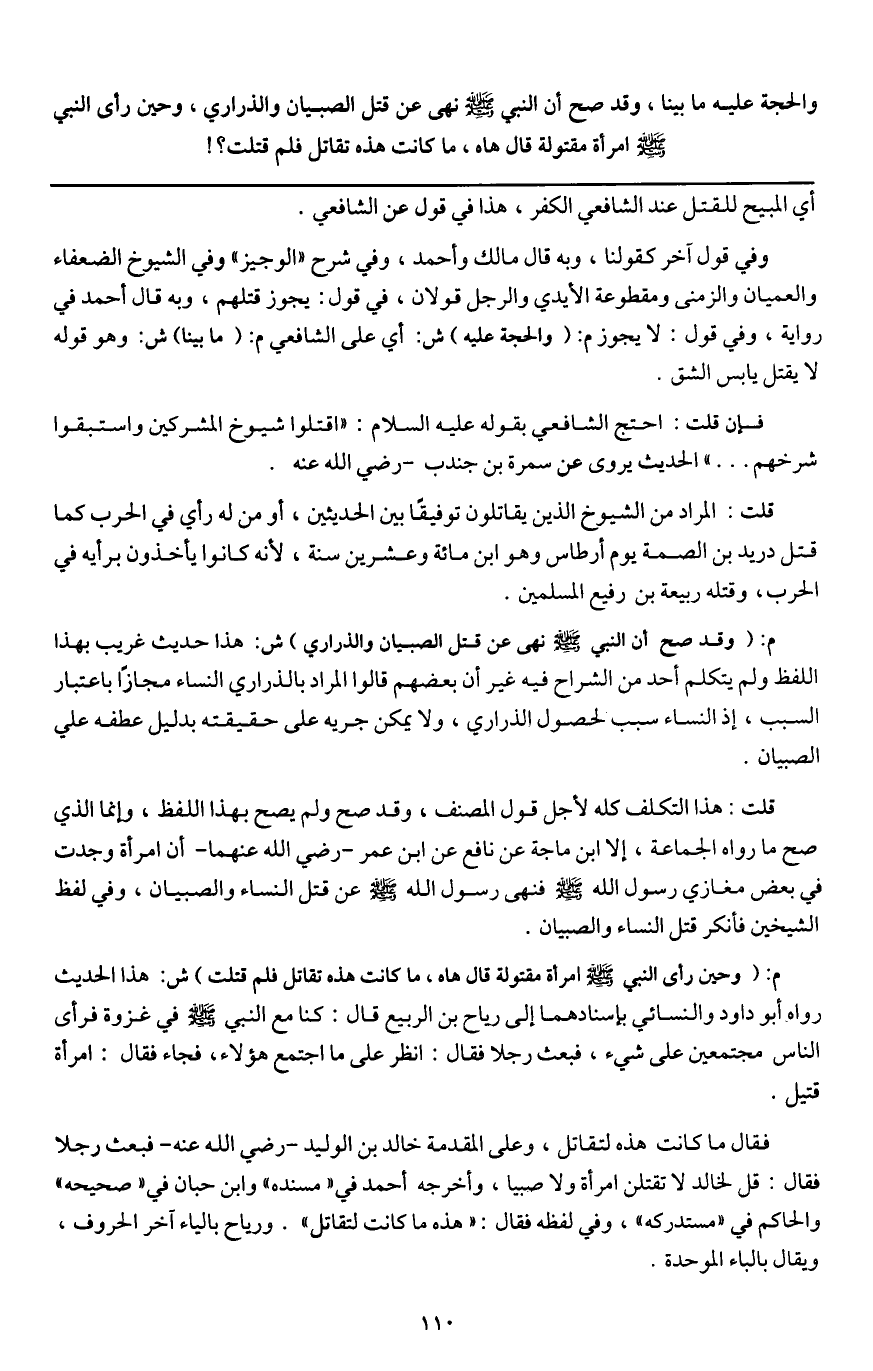 والحجة عليه ما بينا، وقد صح «أن النبي - صَلَّى اللَّهُ عَلَيْهِ وَسَلَّمَ - نهى عن قتل الصبيان والذراري، وحين رأى النبي - صَلَّى اللَّهُ عَلَيْهِ وَسَلَّمَ - امرأة مقتولة قال هاه، ما كانت هذه تقاتل فلم قتلت؟!»