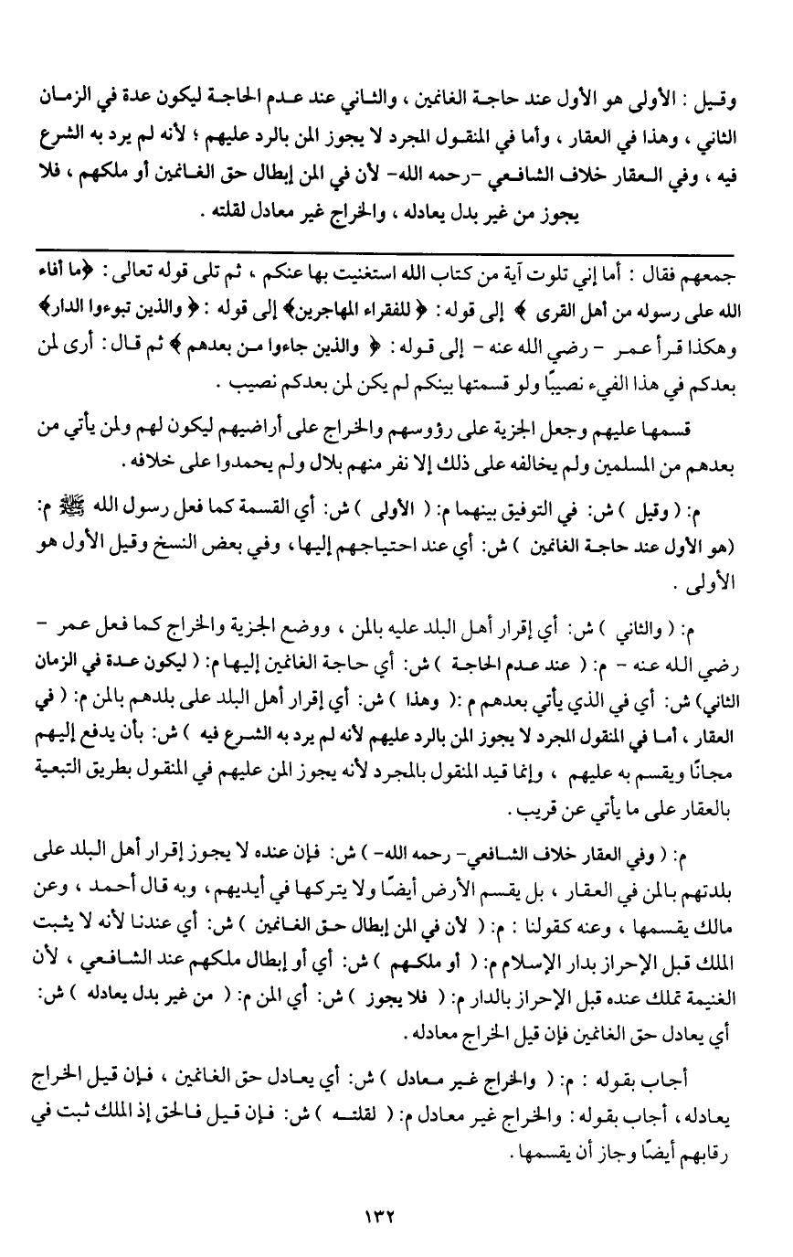 ـــــــــــــــــــــــــــــQجمعهم فقال: أما إني تلوت آية من كتاب الله استغنيت بها عنكم، ثم تلا قَوْله تَعَالَى: {مَا أَفَاءَ اللَّهُ عَلَى رَسُولِهِ مِنْ أَهْلِ الْقُرَى} [الحشر: 7] إلى قوله: {لِلْفُقَرَاءِ الْمُهَاجِرِينَ} [الحشر: 8] إلى قوله: {وَالَّذِينَ تَبَوَّءُوا الدَّارَ} [الحشر: 9] وهكذا قرأ عمر - رَضِيَ اللَّهُ عَنْهُ - إلى قوله: {وَالَّذِينَ جَاءُوا مِنْ بَعْدِهِمْ} [الحشر: 10] ثم قال: أرى لمن بعدكم في هذا الفيء نصيباً ولو قسمتها بينكم لم يكن لمن بعدكم نصيب.