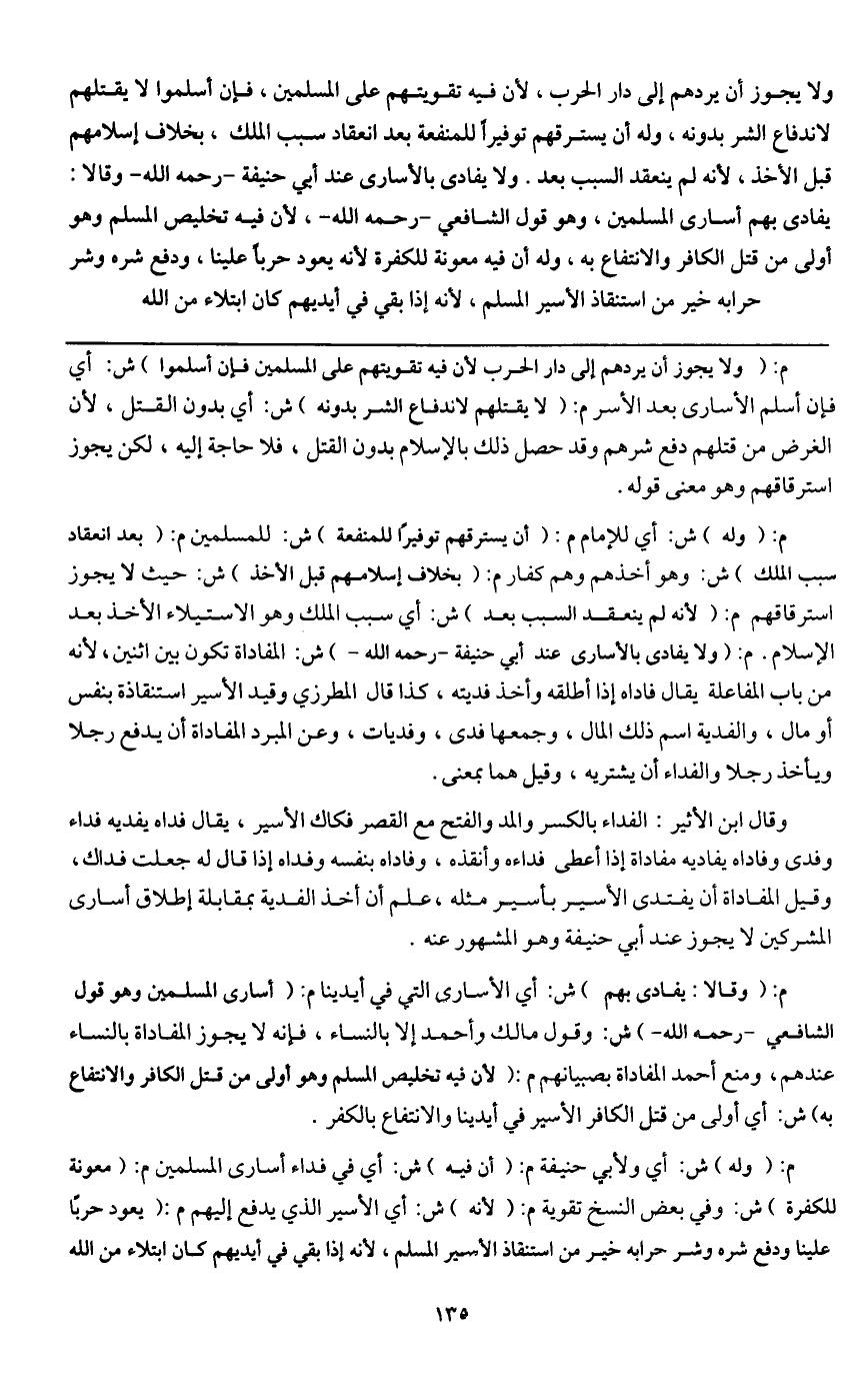 ولا يجوز أن يردهم إلى دار الحرب، لأن فيه تقويتهم على المسلمين، فإن أسلموا لا يقتلهم لاندفاع الشر بدونه، وله أن يسترقهم توفيرا للمنفعة بعد انعقاد سبب الملك، بخلاف إسلامهم قبل الأخذ، لأنه لم ينعقد السبب بعد. ولا يفادى بالأسارى عند أبي حنيفة - رَحِمَهُ اللَّهُ - وقالا: يفادى بهم أسارى المسلمين، وهو قول الشافعي - رَحِمَهُ اللَّهُ - لأن فيه تخليص المسلم وهو أولى من قتل الكافر والانتفاع به، وله أن فيه معونة للكفرة لأنه يعود حربا علينا، ودفع شره وشر حرابه خير من استنقاذ الأسير المسلم، لأنه إذا بقي في أيديهم كان ابتلاء من الله