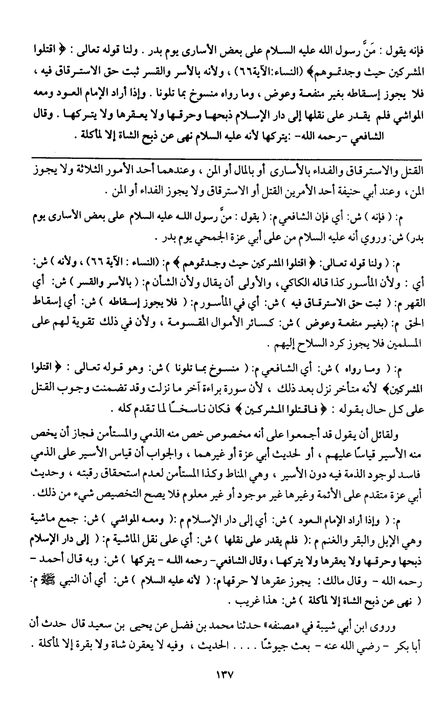 ـــــــــــــــــــــــــــــQالقتل والاسترقاق والفداء بالأسارى أو بالمال أو المن، وعندهما أحد الأمور الثلاثة، ولا يجوز المن، وعند أبي حنيفة أحد الأمرين: القتل أو الاسترقاق، ولا يجوز الفداء أو المن.