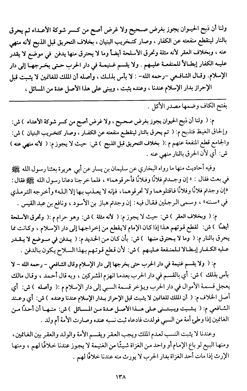 ولنا أن ذبح الحيوان يجوز بغرض صحيح، ولا غرض أصح من كسر شوكة الأعداء، ثم يحرق بالنار لينقطع منفعته عن الكفار، وصار كتخريب البنيان، بخلاف التحريق قبل الذبح لأنه منهي عنه، وبخلاف العقر لأنه مثلة، وتحرق الأسلحة أيضا وما لا يحترق منها يدفن في موضع لا يقدر عليه الكفار إبطالا للمنفعة عليهم.