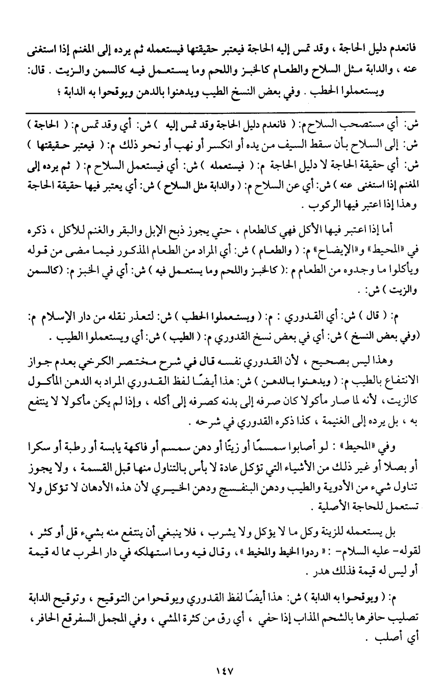 فانعدم دليل الحاجة، وقد تمس إليه الحاجة فيعتبر حقيقتها فيستعمله ثم يرده إلى المغنم إذا استغنى عنه، والدابة مثل السلاح والطعام كالخبز واللحم وما يستعمل فيه كالسمن والزيت.