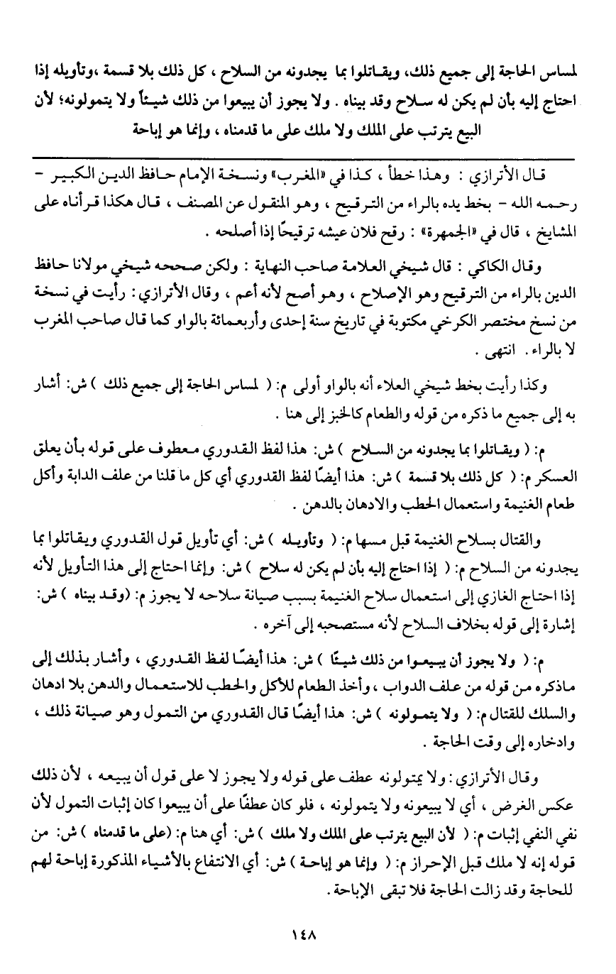لمساس الحاجة إلى جميع ذلك، ويقاتلوا بما يجدونه من السلاح، كل ذلك بلا قسمة، وتأويله إذا احتاج إليه بأن لم يكن له سلاح وقد بيناه. ولا يجوز أن يبيعوا من ذلك شيئا ولا يتمولونه؛ لأن البيع يترتب على الملك ولا ملك على ما قدمناه، وإنما هو إباحة