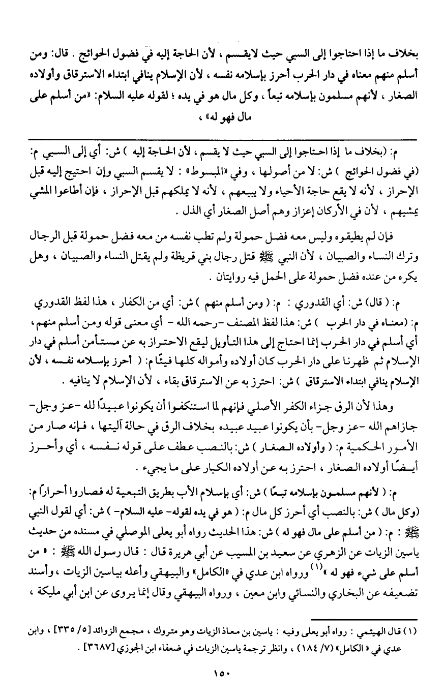 م: (لأنهم مسلمون بإسلامه تبعاً) ش: أي بإسلام الأب بطريق التبعية له فصاروا أحراراً م: (وكل مال) ش: بالنصب أي أحرز كل مال م: (هو في يده لقوله - عَلَيْهِ السَّلَامُ -) ش: أي لقول النبي - صَلَّى اللَّهُ عَلَيْهِ وَسَلَّمَ -: م: «من أسلم على مال فهو له» ش: هذا الحديث رواه أبو يعلى الموصلي في مسنده من حديث ياسين الزيات عن الزهري عن سعيد بن المسيب عن أبي هريرة قال: قال رسول الله - صَلَّى اللَّهُ عَلَيْهِ وَسَلَّمَ -: «من أسلم على شيء فهو له» ورواه ابن عدي في " الكامل "، والبيهقي وأعله بياسين الزيات، وأسند تضعيفه عن البخاري والنسائي وابن معين، ورواه البيهقي وقال: إنما يروى عن ابن أبي مليكة،