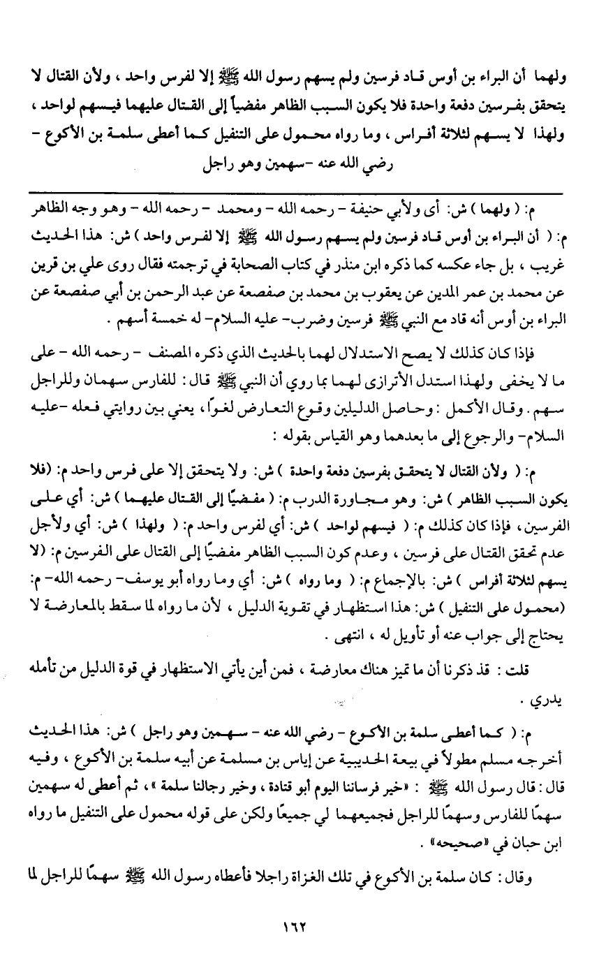 ولهما «أن البراء بن أوس قاد فرسين ولم يسهم رسول الله - صَلَّى اللَّهُ عَلَيْهِ وَسَلَّمَ - إلا لفرس واحد» ولأن القتال لا يتحقق بفرسين دفعة واحدة، فلا يكون السبب الظاهر مفضيا إلى القتال عليهما فيسهم لواحد، ولهذا لا يسهم لثلاثة أفراس، وما رواه محمول على التنفيل كما أعطى سلمة بن الأكوع - رَضِيَ اللَّهُ عَنْهُ - سهمين وهو راجل