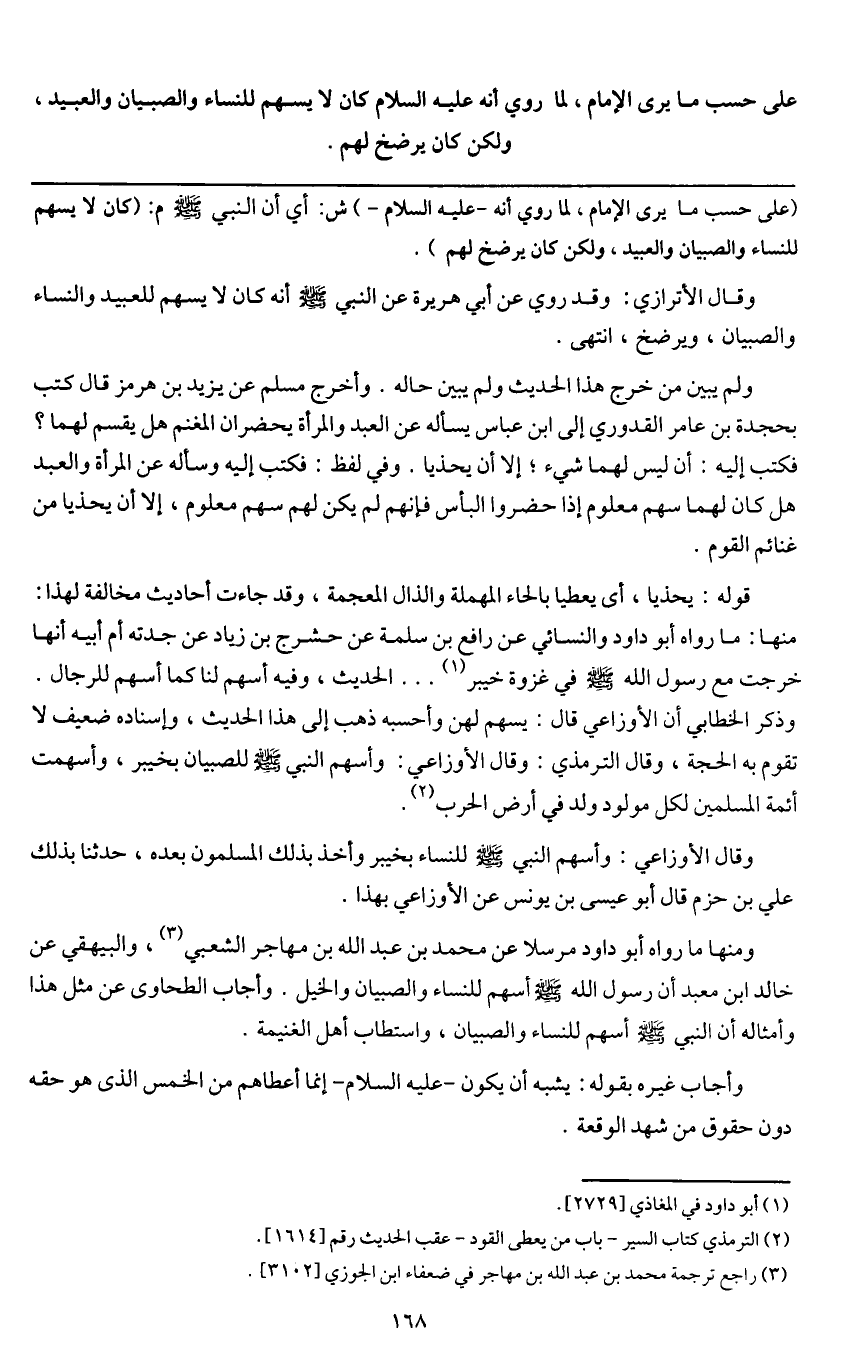 ولم يبين من خرج هذا الحديث ولم يبين حاله. وأخرج مسلم عن يزيد عن هرمز قال: كتب بحجدة بن عامر القدوري إلى ابن عباس يسأله عن العبد والمرأة يحضران المغنم هل يقسم لهما؟ فكتب إليه: أن ليس لهما شيء إلا أن يحذيا. وفي لفظ: فكتب إليه وسأله عن المرأة والعبد هل كان لهما سهم معلوم إذا حضروا البأس، فإنهم لم يكن لهم سهم معلوم، إلا أن يحذيا من غنائم القوم.
