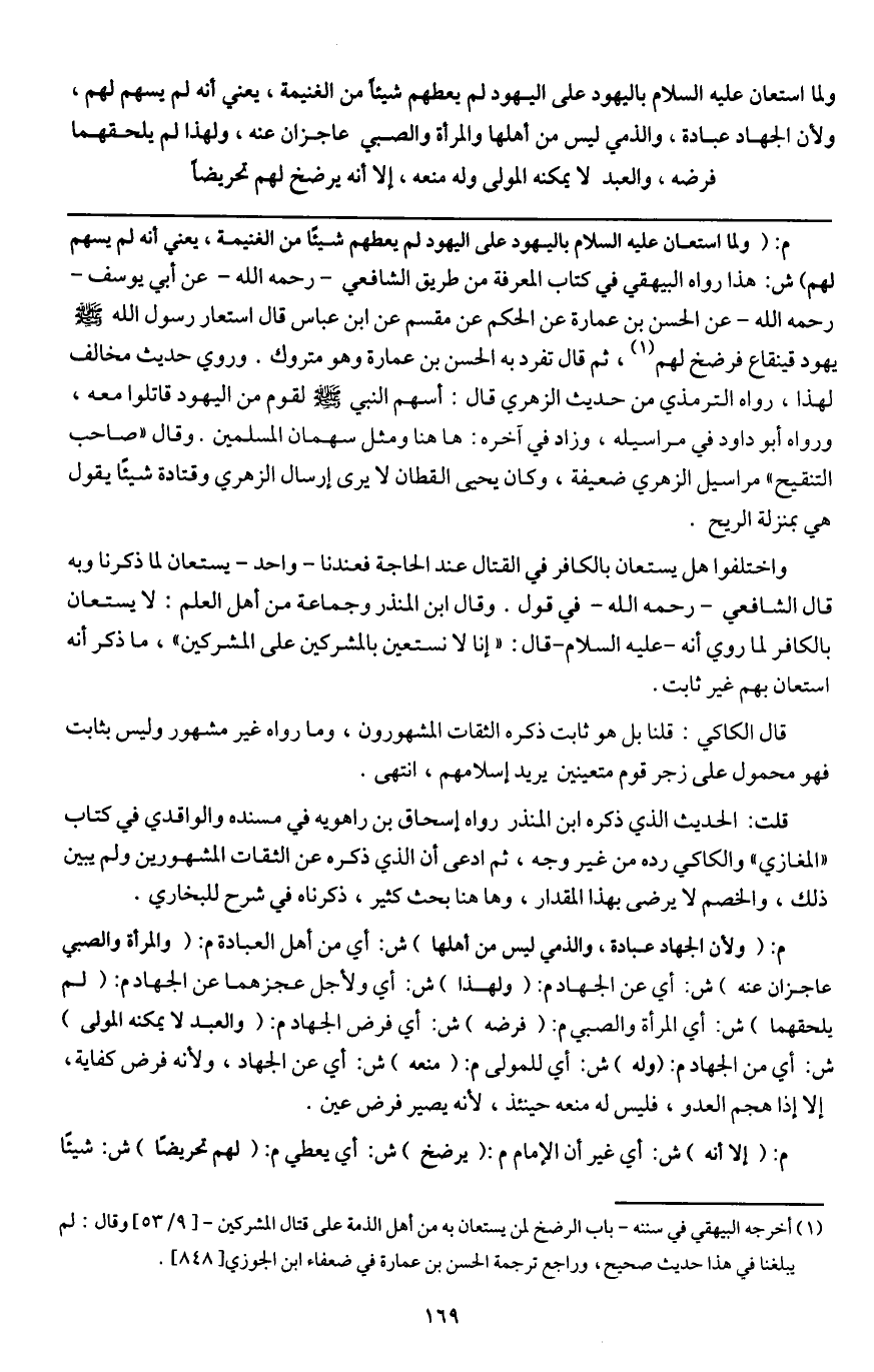 ـــــــــــــــــــــــــــــQم: (ولما استعان - عَلَيْهِ السَّلَامُ - باليهود على اليهود لم يعطهم شيئاً من الغنيمة، يعني أنه لم يسهم لهم) ش: هذا رواه البيهقي في كتاب المعرفة من طريق الشافعي - رَحِمَهُ اللَّهُ - عن أبي يوسف - رَحِمَهُ اللَّهُ - عن الحسن بن عمارة عن الحكم عن مقسم عن ابن عباس قال: «استعار رسول الله - صَلَّى اللَّهُ عَلَيْهِ وَسَلَّمَ - يهود قينقاع فرضخ لهم» . ثم قال: تفرد به الحسن بن عمارة، وهو متروك. وروي حديث مخالف لهذا، رواه الترمذي من حديث الزهري قال: «أسهم النبي - صَلَّى اللَّهُ عَلَيْهِ وَسَلَّمَ - لقوم من اليهود قاتلوا معه» ورواه أبو داود في مراسيله، وزاد في آخره «هاهنا: ومثل سهمان المسلمين» . وقال " صاحب التنقيح ": مراسيل الزهري ضعيفة، وكان يحيى القطان لا يرى إرسال الزهري وقتادة شيئاًَ يقول: هي بمنزلة الريح.