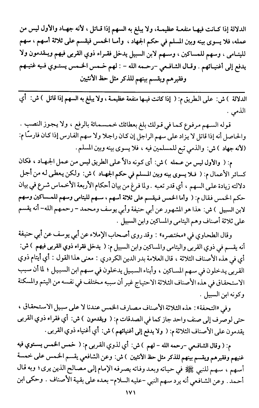 الدلالة إذا كانت فيها منفعة عظيمة، ولا يبلغ به السهم إذا قاتل لأنه جهاد، والأول ليس من عمله، فلا يسوى بينه وبين المسلم في حكم الجهاد، وأما الخمس فيقسم على ثلاثة أسهم، سهم لليتامى، وسهم للمساكين، وسهم لابن السبيل، يدخل فقراء ذوي القربى فيهم ويقدمون ولا يدفع إلى أغنيائهم. وقال الشافعي - رَحِمَهُ اللَّهُ -: لهم خمس الخمس يستوي فيه غنيهم وفقيرهم ويقسم بينهم، للذكر مثل حظ الأنثيين