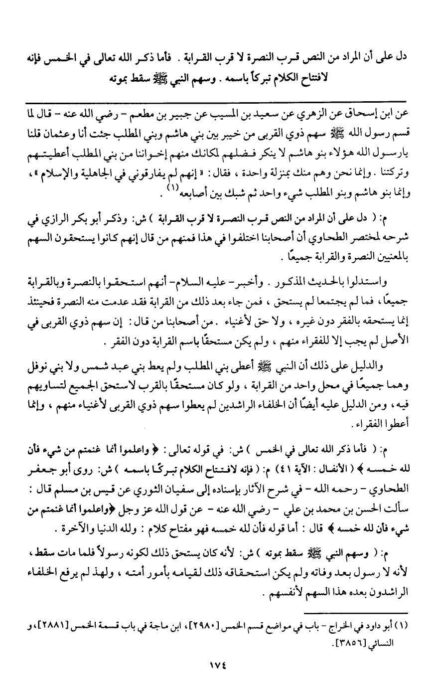 دل على أن المراد من النص قرب النصرة لا قرب القرابة. فأما ذكر الله تعالى في الخمس فإنه لافتتاح الكلام تبركا باسمه.