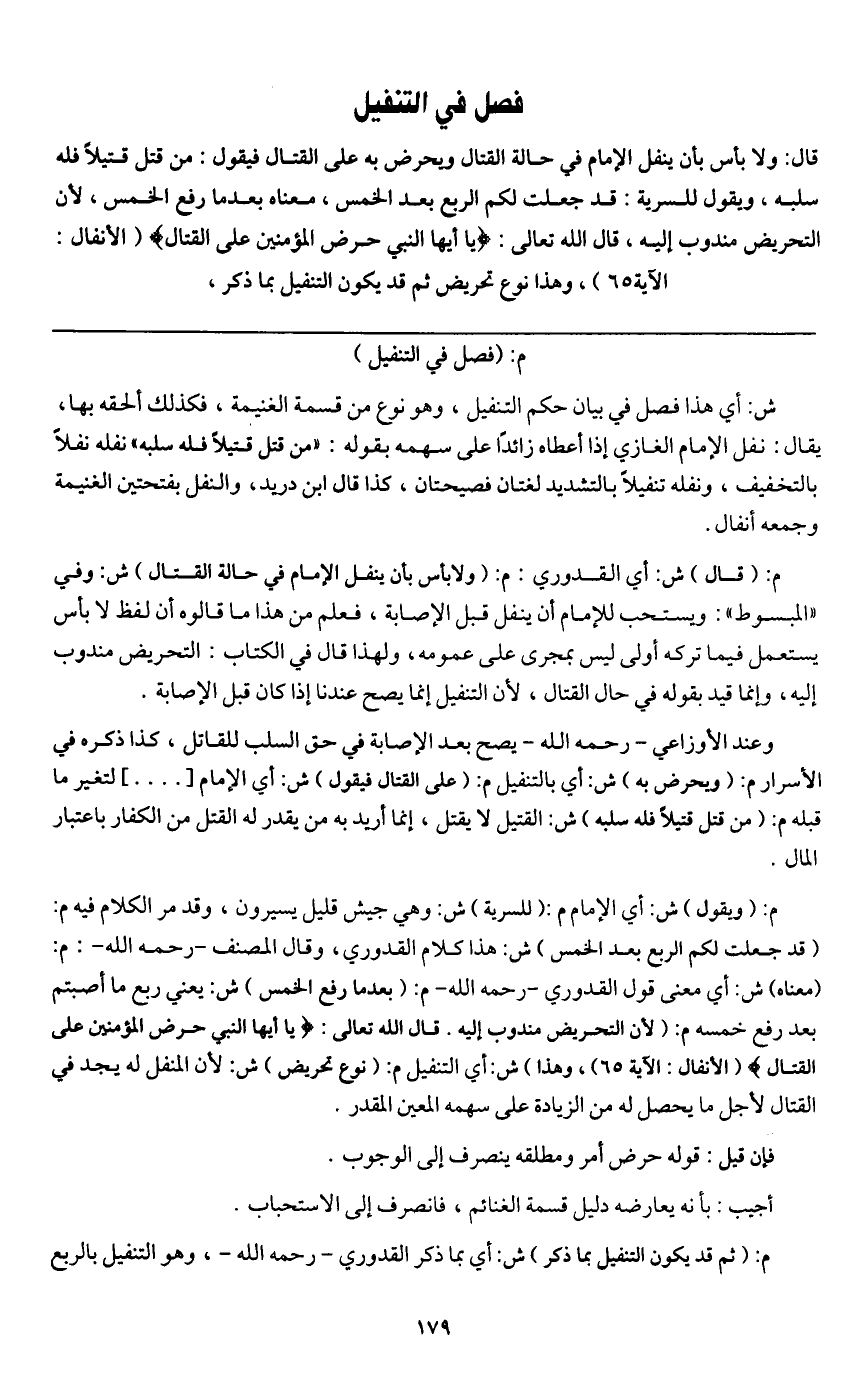 فصل في التنفيل قال: ولا بأس بأن ينفل الإمام في حالة القتال ويحرض به على القتال فيقول: من قتل قتيلا فله سلبه، ويقول للسرية: قد جعلت لكم الربع بعد الخمس، معناه بعدما رفع الخمس، لأن التحريض مندوب إليه، قال الله تعالى: {يَا أَيُّهَا النَّبِيُّ حَرِّضِ الْمُؤْمِنِينَ عَلَى الْقِتَالِ} [الأنفال: 65] (الأنفال: الآية 65) ، وهذا نوع تحريض ثم قد يكون التنفيل بما ذكر،