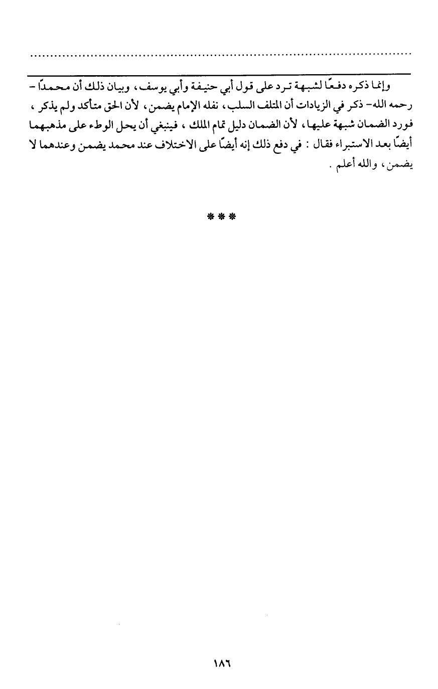 ـــــــــــــــــــــــــــــQوإنما ذكره دفعاً لشبهة ترد على قول أبي حنيفة وأبي يوسف، وبيان ذلك أن محمداً - رَحِمَهُ اللَّهُ - ذكر في الزيادات أن المتلف السلب، نفله الإمام يضمن، لأن الحق متأكد ولم يذكر، فورد الضمان شبهة عليها، لأن الضمان دليل تمام الملك، فينبغي أن يحل الوطء على مذهبهما أيضاً بعد الاستبراء فقال في دفع ذلك: إنه أيضاً على الاختلاف، عند محمد: يضمن، وعندهما: لا يضمن، والله أعلم.