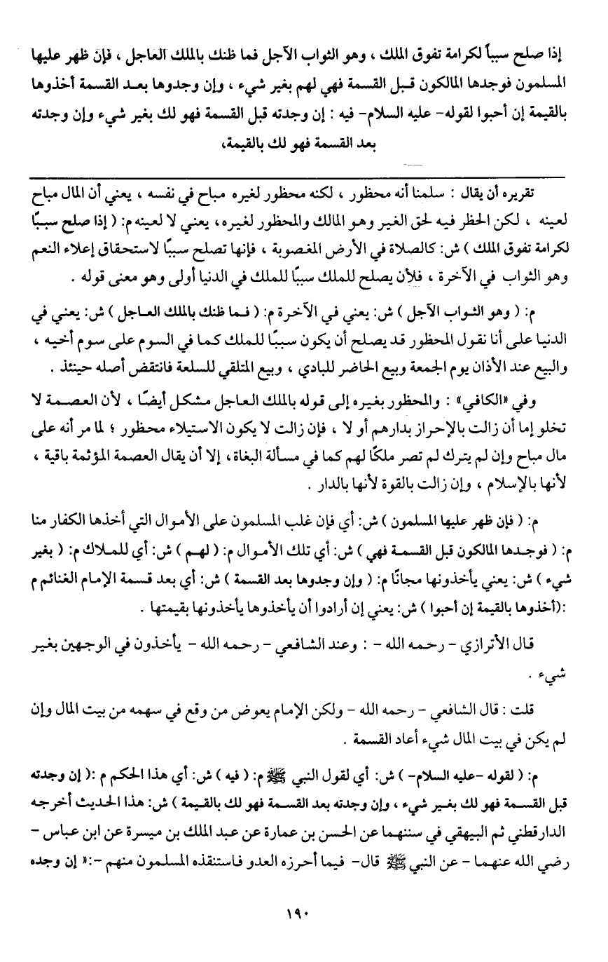 إذا صلح سببا لكرامة تفوق الملك، وهو الثواب الآجل، فما ظنك بالملك العاجل، فإن ظهر عليها المسلمون فوجدها المالكون قبل القسمة فهي لهم بغير شيء، وإن وجدوها بعد القسمة أخذوها بالقيمة إن أحبوا؛ لقوله - عَلَيْهِ السَّلَامُ - فيه: إن وجدته قبل القسمة فهو لك بغير شيء، وإن وجدته بعد القسمة فهو لك بالقيمة،