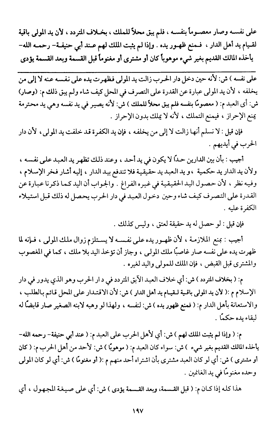 أجيب: بأن بين الدارين حداً لا يكون في يد أحد، وعند ذلك تظهر يد العبد على نفسه، ولأن يد الدار يد حكمية، ويد العبد يد حقيقية فلا تندفع بيد الدار، إليه أشار فخر الإسلام، وفيه نظر، لأن حصول اليد الحقيقية في غيره الفراغ. والجواب أن اليد كما ذكرنا عبارة عن القدرة على التصرف كيف شاء وحين دخول العبد في دار الحرب يحصل له ذلك قبل استيلاء الكفرة عليه.