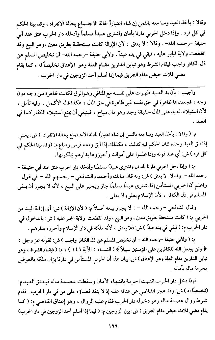 وإذا دخل الحربي دارنا بأمان واشترى عبدا مسلما وأدخله دار الحرب عتق عند أبي حنيفة - رَحِمَهُ اللَّهُ - وقالا: لا يعتق، لأن الإزالة كانت مستحقة بطريق معين، وهو البيع وقد انقطعت ولاية الجبر عليه، فبقي في يده عبدا،