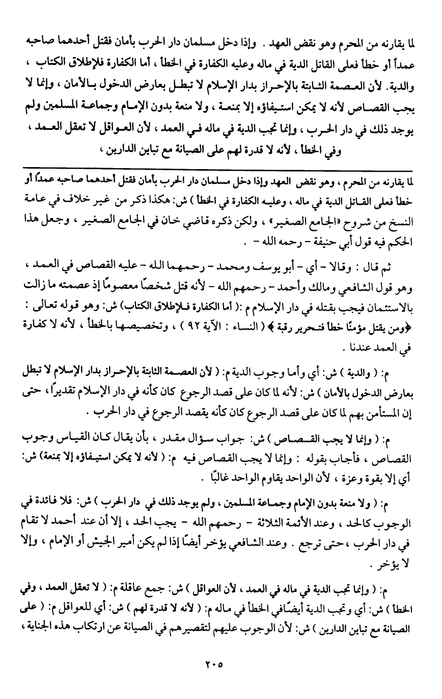 لما يقارنه من المحرم، وهو نقض العهد. وإذا دخل مسلمان دار الحرب بأمان فقتل أحدهما صاحبه عمدا أو خطأ فعلى القاتل الدية في ماله وعليه الكفارة في الخطأ، أما الكفارة فلإطلاق الكتاب، والدية لأن العصمة الثابتة بالإحراز بدار الإسلام لا تبطل بعارض الدخول بالأمان، وإنما لا يجب القصاص لأنه لا يمكن استيفاؤه إلا بمنعة،