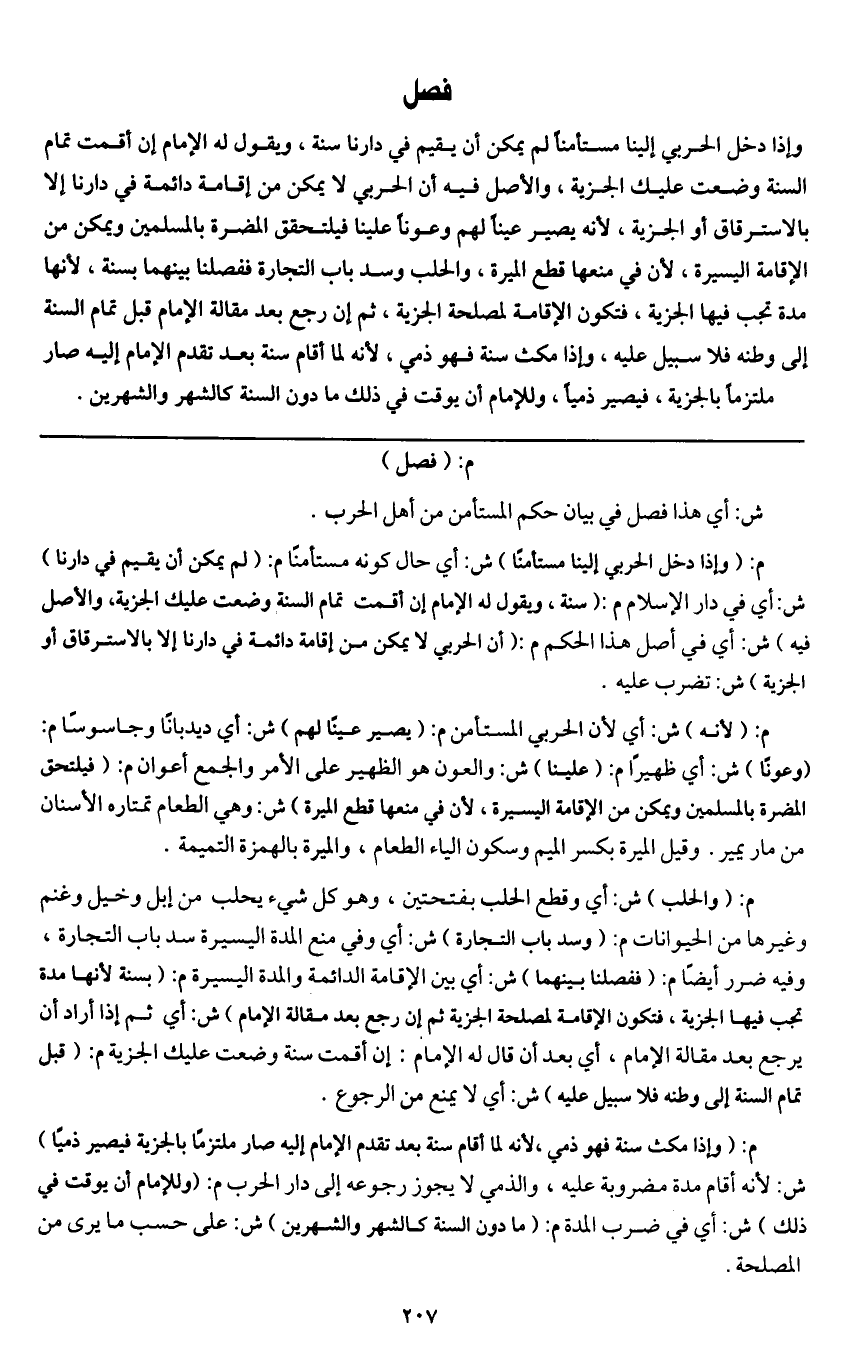 فصل وإذا دخل الحربي إلينا مستأمنا لم يمكن أن يقيم في دارنا سنة، ويقول له الإمام: إن أقمت تمام السنة وضعت عليك الجزية، والأصل فيه أن الحربي لا يمكن من إقامة دائمة في دارنا إلا بالاسترقاق أو الجزية، لأنه يصير عينا لهم وعونا علينا فيلحق المضرة بالمسلمين ويمكن من الإقامة اليسيرة، لأن في منعها قطع الميرة، والحلب وسد باب التجارة، ففصلنا بينها بسنة، لأنها مدة تجب فيها الجزية، فتكون الإقامة لمصلحة الجزية، ثم إن رجع بعد مقالة الإمام قبل تمام السنة إلى وطنه، فلا سبيل عليه، وإذا مكث سنة فهو ذمي، لأنه لما أقام سنة بعد تقدم الإمام إليه صار ملتزما بالجزية، فيصير ذميا، وللإمام أن يوقت في ذلك ما دون السنة كالشهر والشهرين.