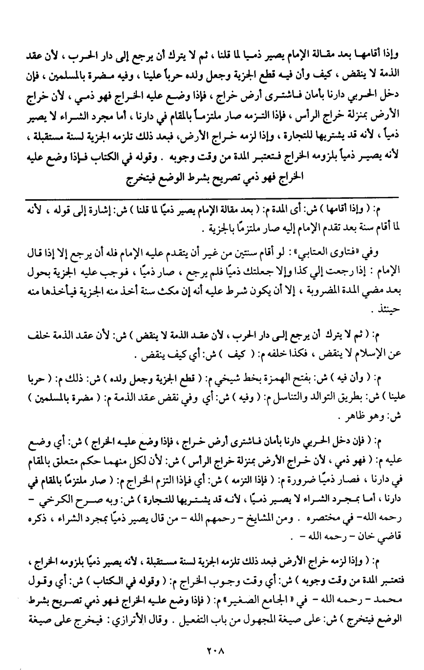 وفي " فتاوى العتابي ": لو أقام سنتين من غير أن يتقدم عليه الإمام فله أن يرجع إلا إذا قال الإمام: إذا رجعت إلى كذا وإلا جعلتك ذمياً، فلم يرجع، صار ذمياً، فوجب عليه الجزية بحول بعد مضي المدة المضروبة، إلا أن يكون شرط عليه أنه إن مكث سنة أخذ منه الجزية، فيأخذها منه حينئذ.