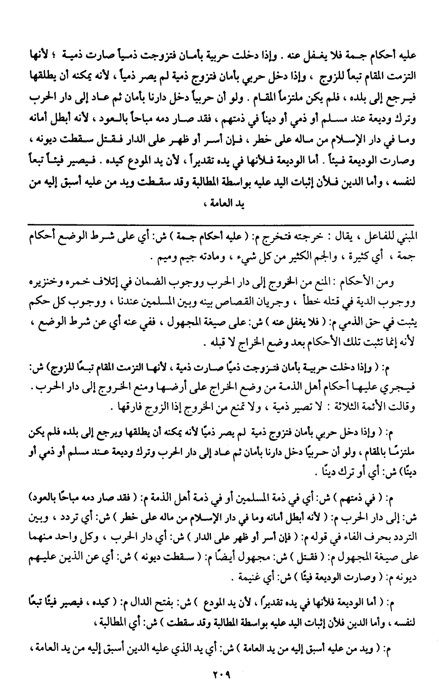 وإذا دخل حربي بأمان فتزوج ذمية لم يصر ذميا، لأنه يمكنه أن يطلقها فيرجع إلى بلده، فلم يكن ملتزما المقام. ولو أن حربيا دخل دارنا بأمان ثم عاد إلى دار الحرب وترك وديعة عند مسلم أو ذمي أو دينا في ذمتهم، فقد صار دمه مباحا بالعود، لأنه أبطل أمانه، وما في دار الإسلام من ماله على خطر، فإن أسر أو ظهر على الدار فقتل سقطت ديونه، وصارت الوديعة فيئا. أما الوديعة فلأنها في يده تقديرا، لأن يد المودع كيده، فيصير فيئا تبعا لنفسه، وأما الدين فلأن إثبات اليد عليه بواسطة المطالبة وقد سقطت ويد من عليه أسبق إليه من يد العامة،