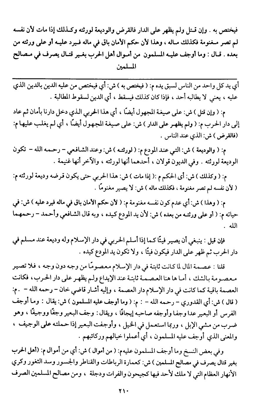 م: (والوديعة) ش: التي عند المودع م: (لورثته) ش: وعند الشافعي - رَحِمَهُ اللَّهُ - تكون الوديعة لورثته. وفي الديون قولان، أحدهما أنها لورثته، والآخر أنها غنيمة.